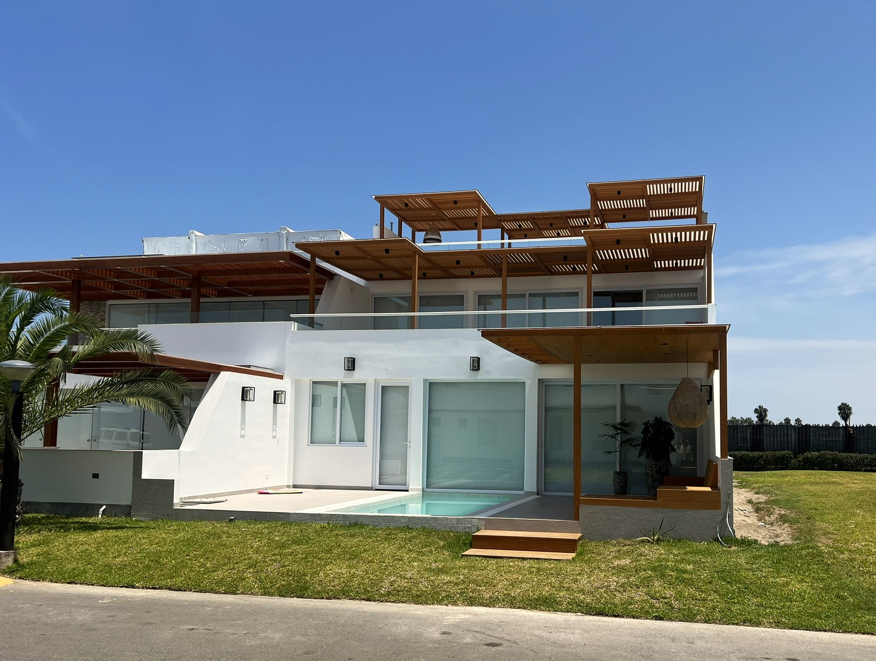 El proyecto se planteó como una vivienda de playa contemporánea de dos niveles, priorizando la integración interior–exterior, el aprovechamiento de la iluminación natural y el confort para uso vacacional. La ejecución se organizó por etapas constructivas claras: cimentación y estructura de concreto armado, levantamiento de muros, losas, carpinterías, acabados y elementos arquitectónicos exteriores como sol y sombra, terrazas y piscina. La coordinación integral entre diseño, estructura y acabados, garantiza una obra ordenada, controlada y alineada a las exigencias del condominio, optimizando tiempos, costos y calidad final del inmueble.