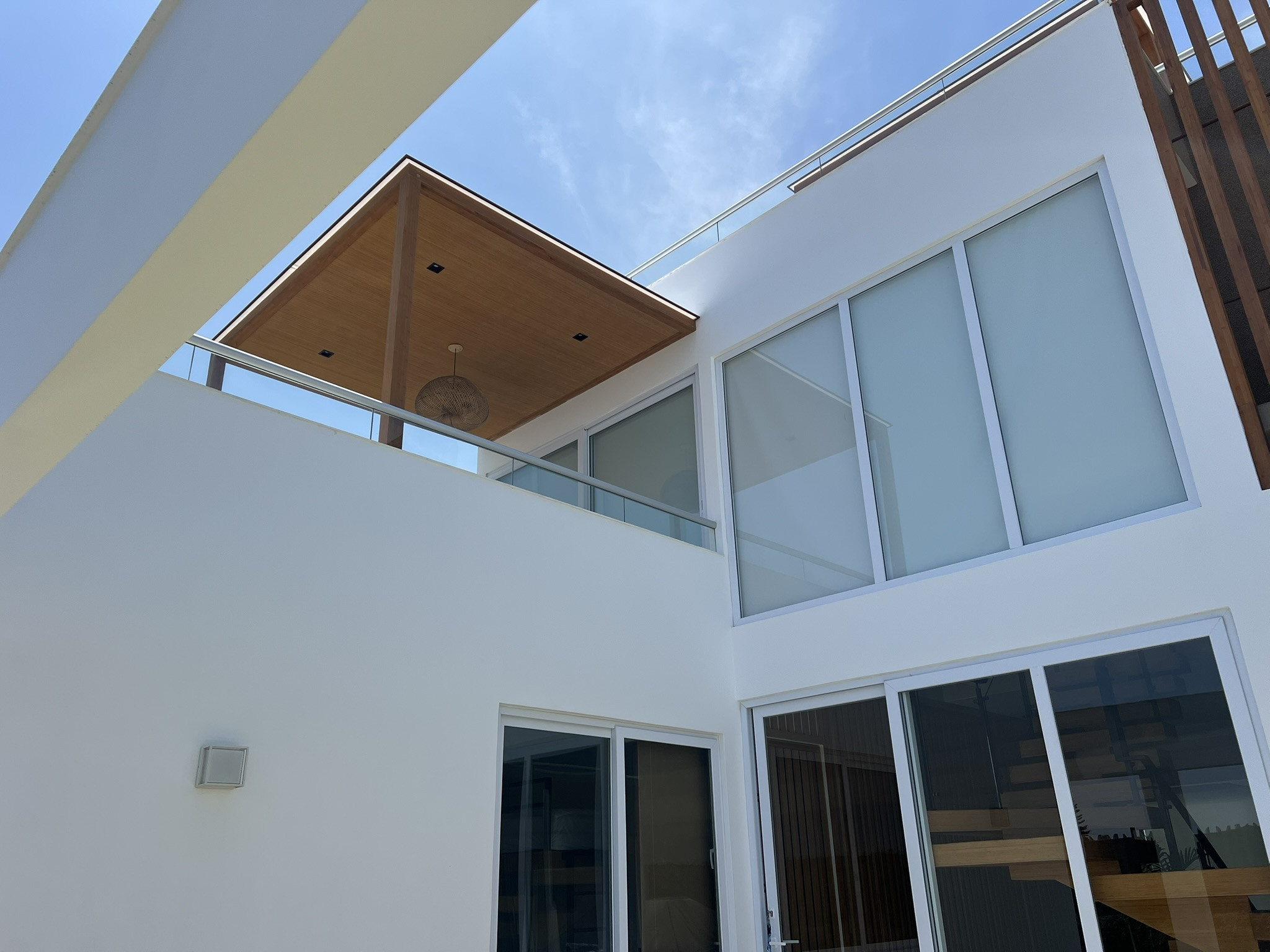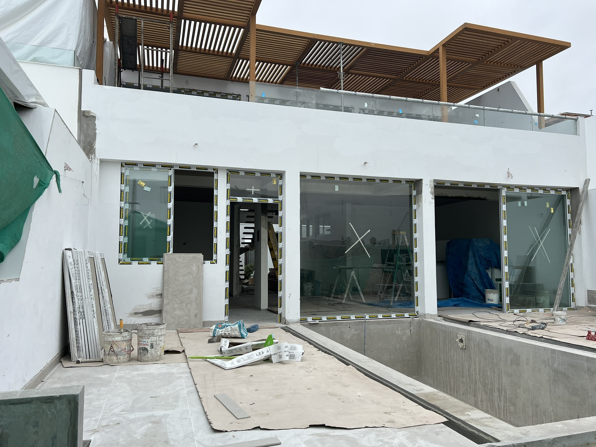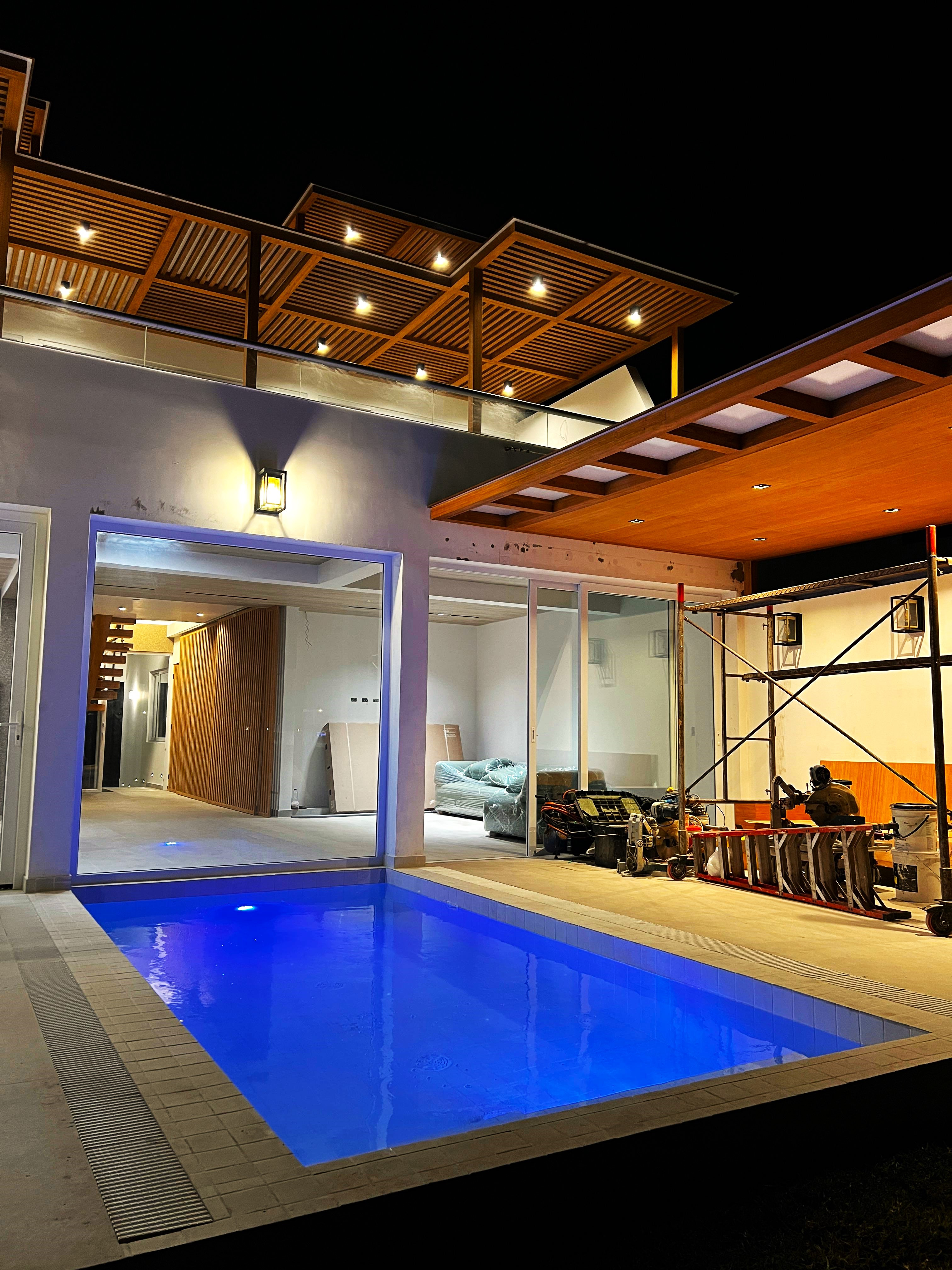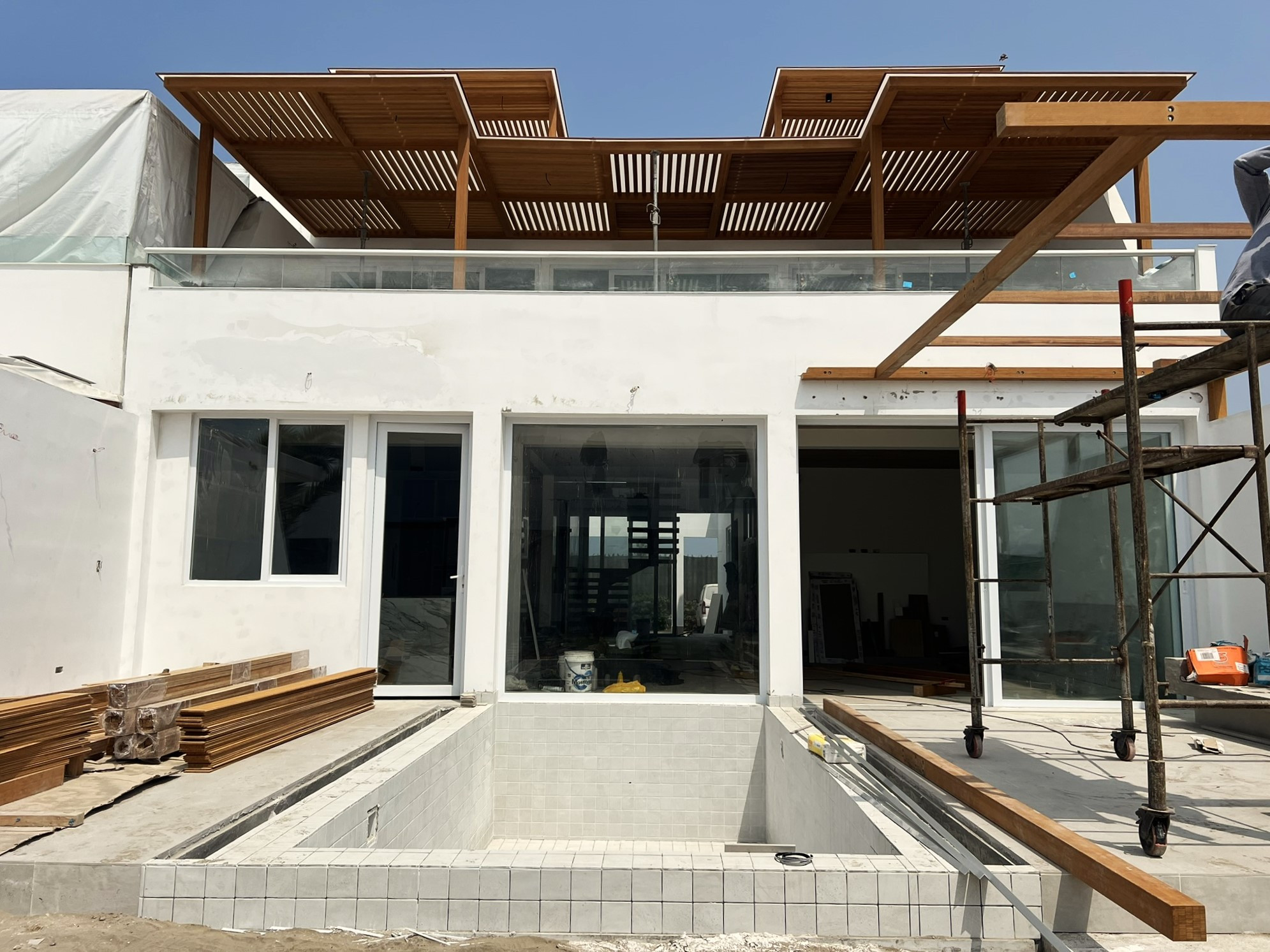 La vivienda se ejecutó con estructura de concreto armado, losas aligeradas y muros portantes, incorporando grandes paños de vidrio templado para iluminación y ventilación cruzada. Se realizaron sol y sombra de madera, barandas de vidrio, acabados en porcelanato y carpintería a medida. La obra contó con supervisión técnica permanente y cronograma de control. Las adaptaciones se resolvieron mediante reprogramación de partidas y coordinación directa con el cliente, manteniendo calidad y plazos.