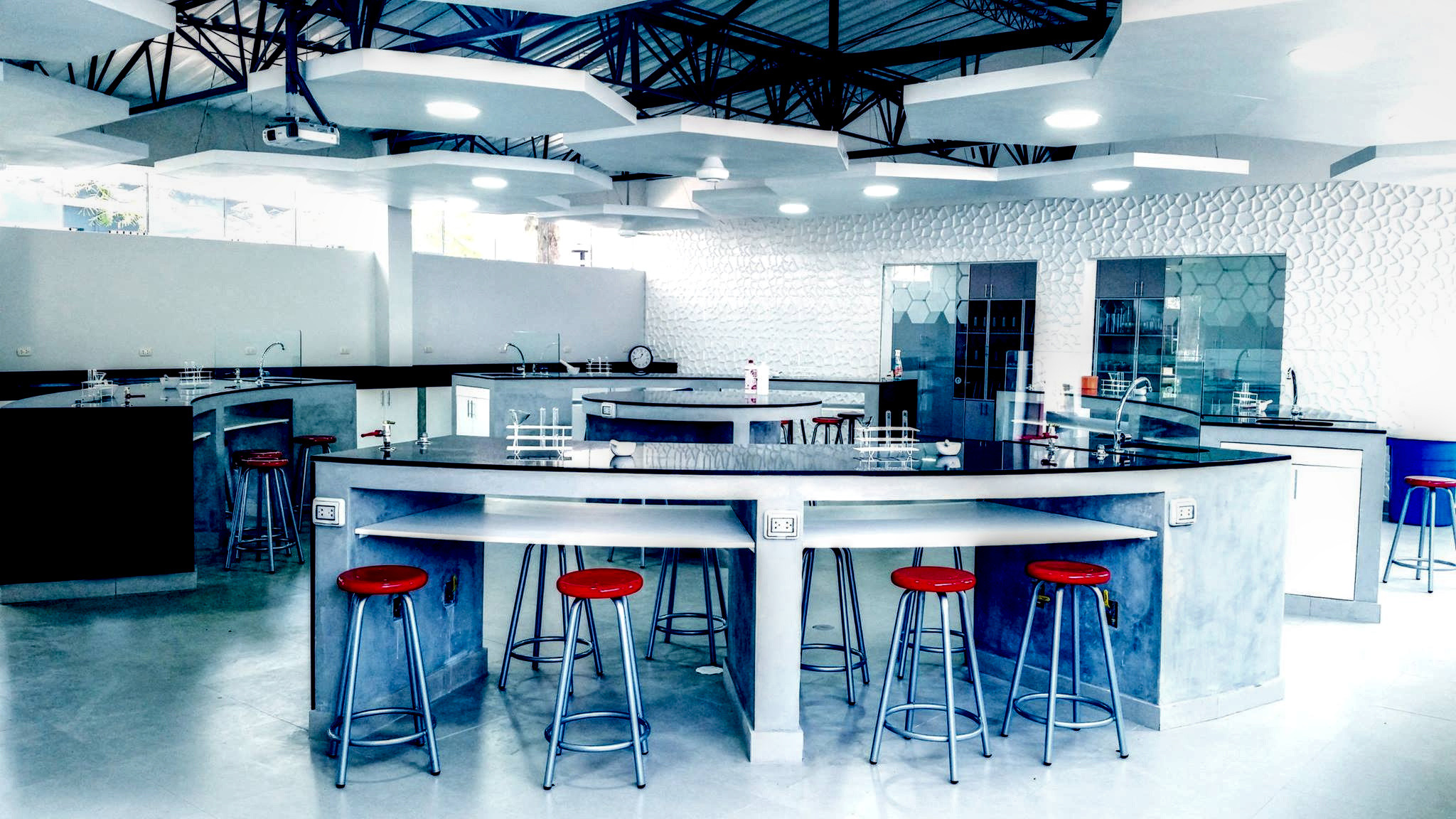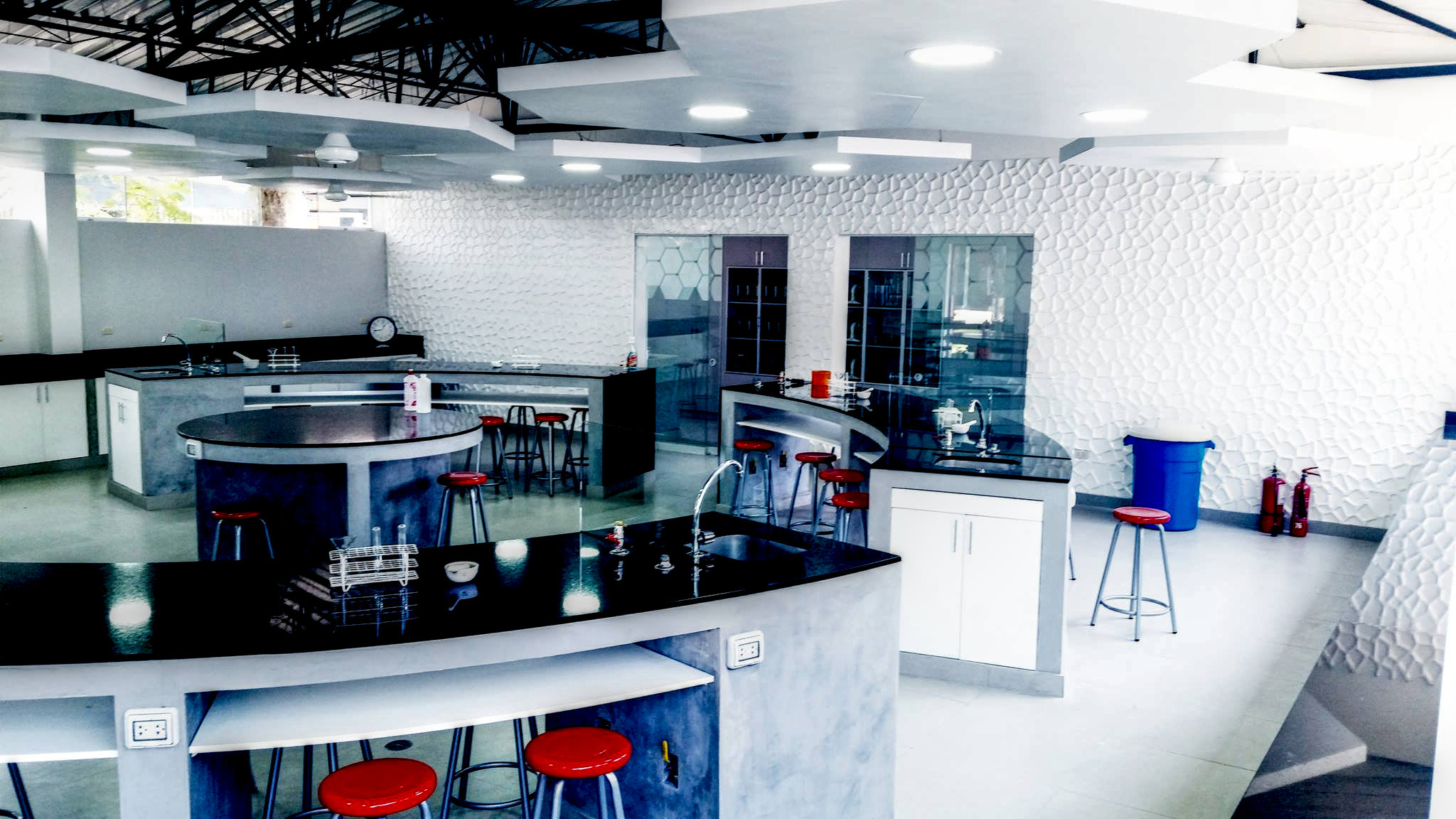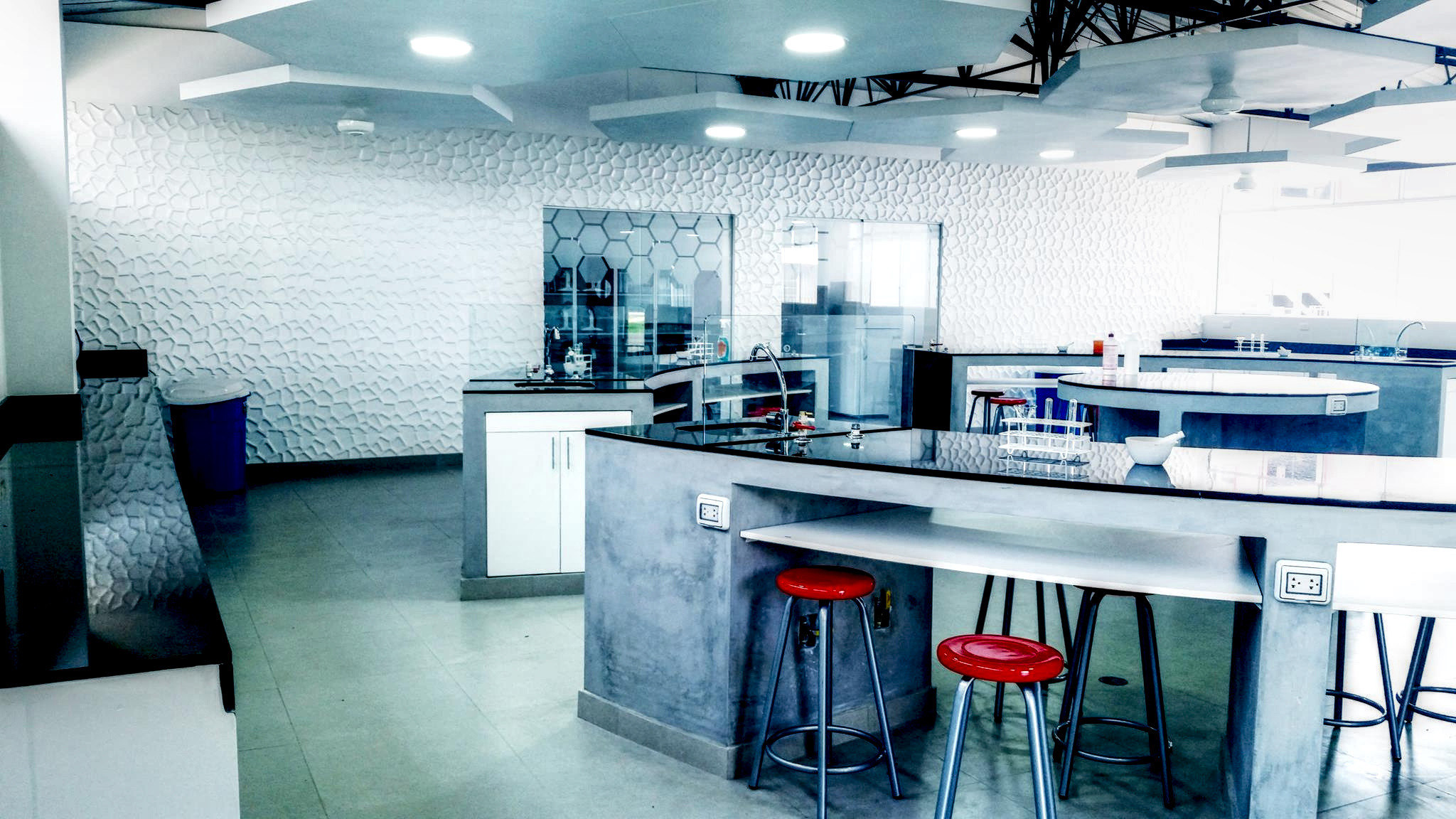 Se incorporó mesadas fijas de concreto armado con acabado en granito pulido, diseñadas para uso intensivo. Se ejecutó la instalación de redes de agua, gas y desagüe con puntos operativos por estación, además de un sistema de ventilación para renovación de aire. El acondicionamiento interior incluyó cielo raso modular hexagonal en MDF, iluminación LED técnica, puertas contraplacadas y mobiliario fabricado en melamina estructural con elementos en vidrio templado, garantizando seguridad, resistencia y eficiencia funcional.