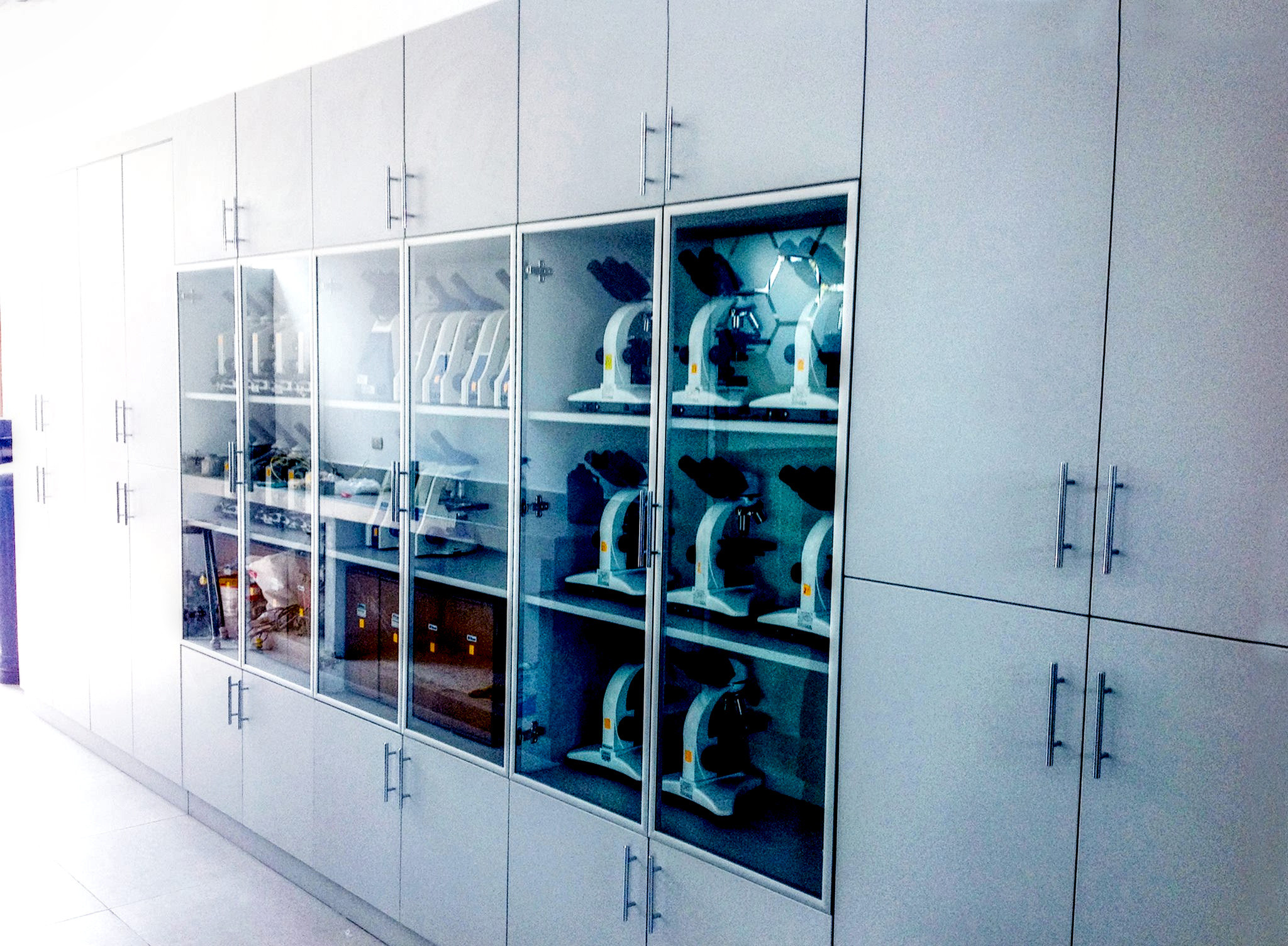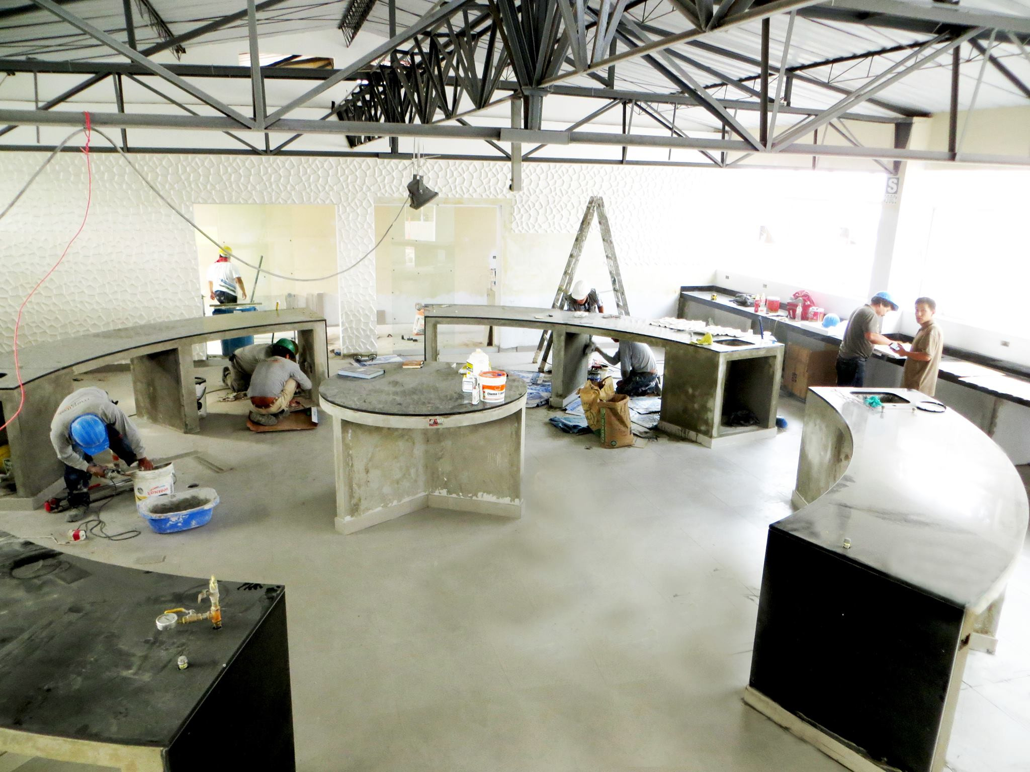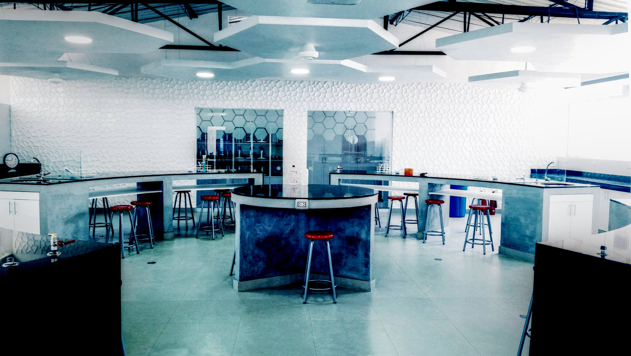 Se incorporó mesadas fijas de concreto armado con acabado en granito pulido, diseñadas para uso intensivo. Se ejecutó la instalación de redes de agua, gas y desagüe con puntos operativos por estación, además de un sistema de ventilación para renovación de aire. El acondicionamiento interior incluyó cielo raso modular hexagonal en MDF, iluminación LED técnica, puertas contraplacadas y mobiliario fabricado en melamina estructural con elementos en vidrio templado, garantizando seguridad, resistencia y eficiencia funcional.