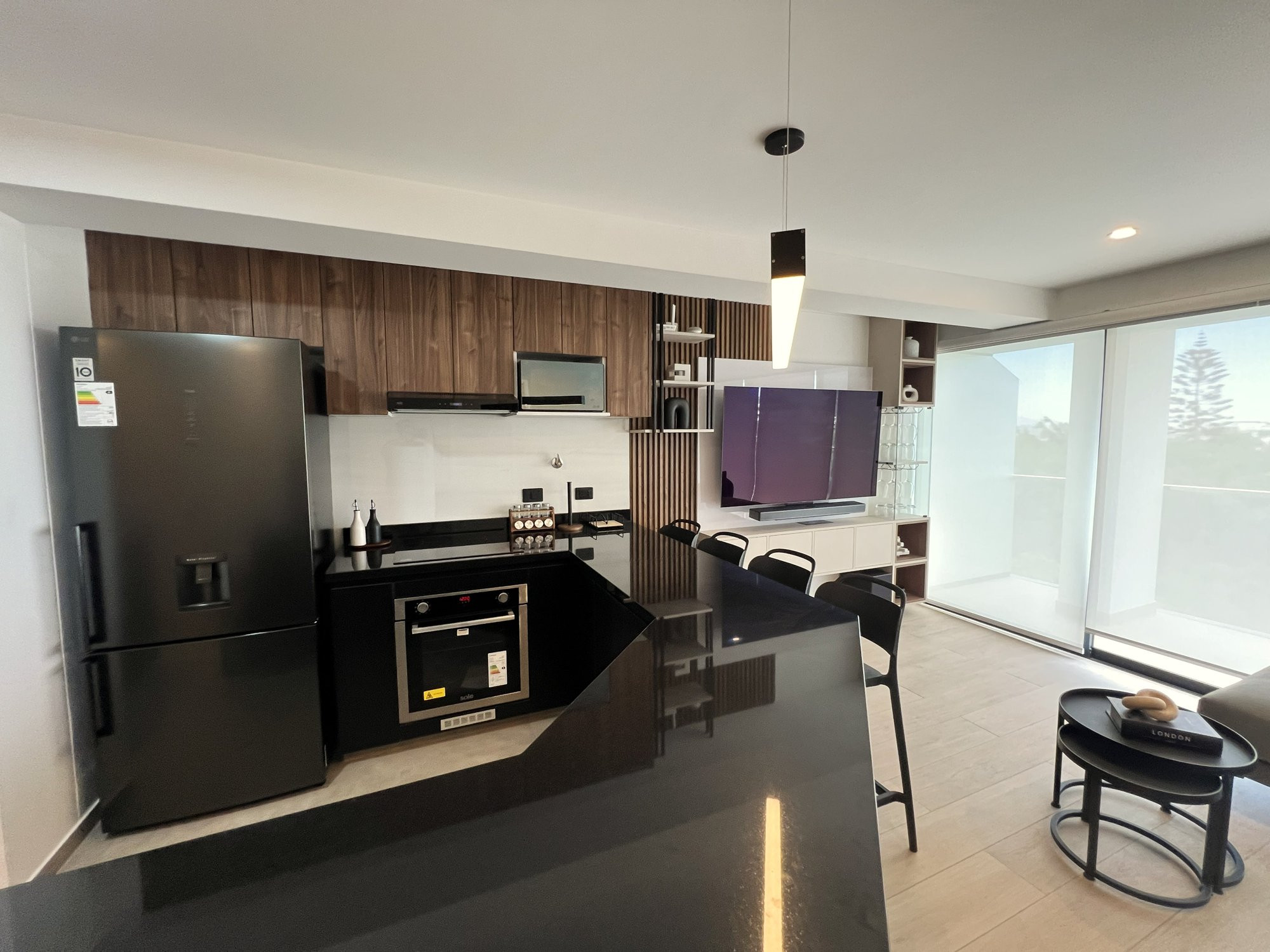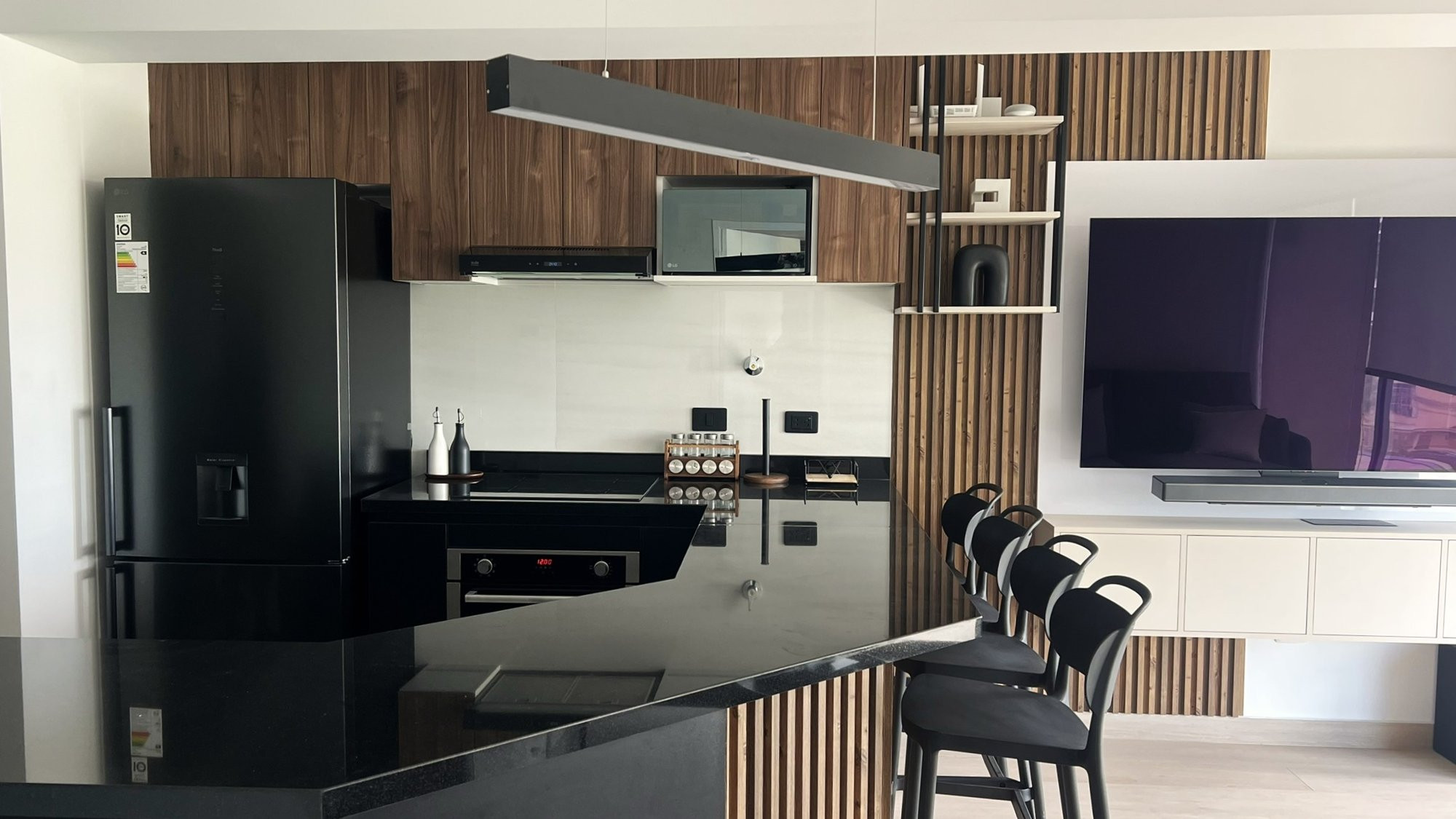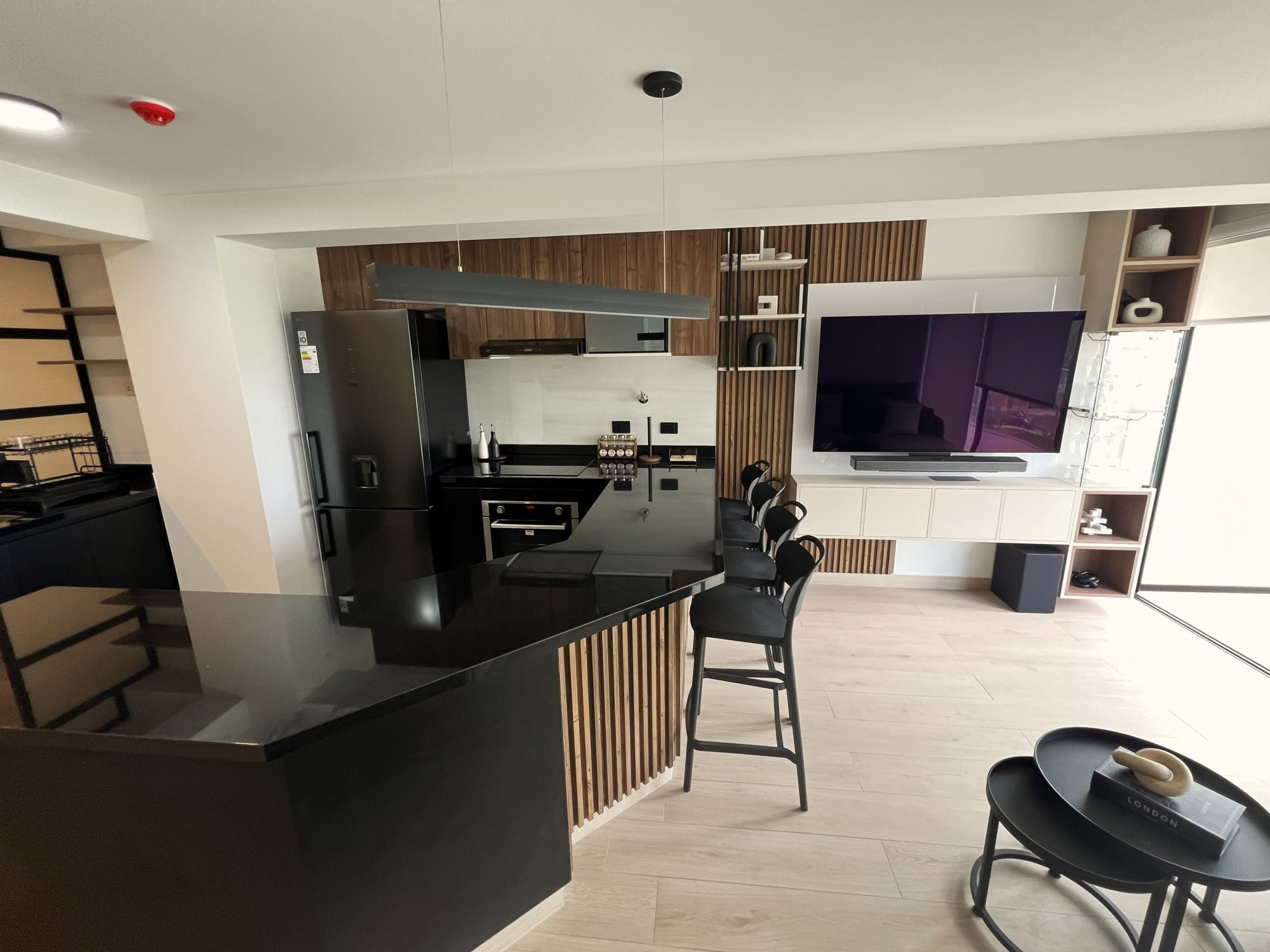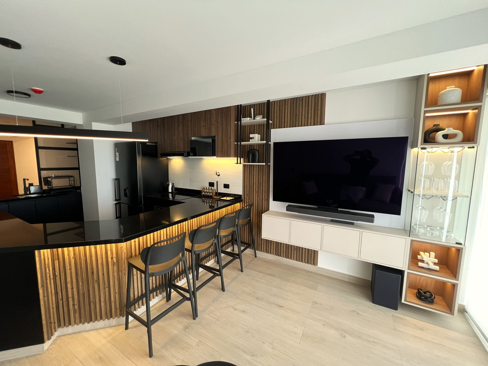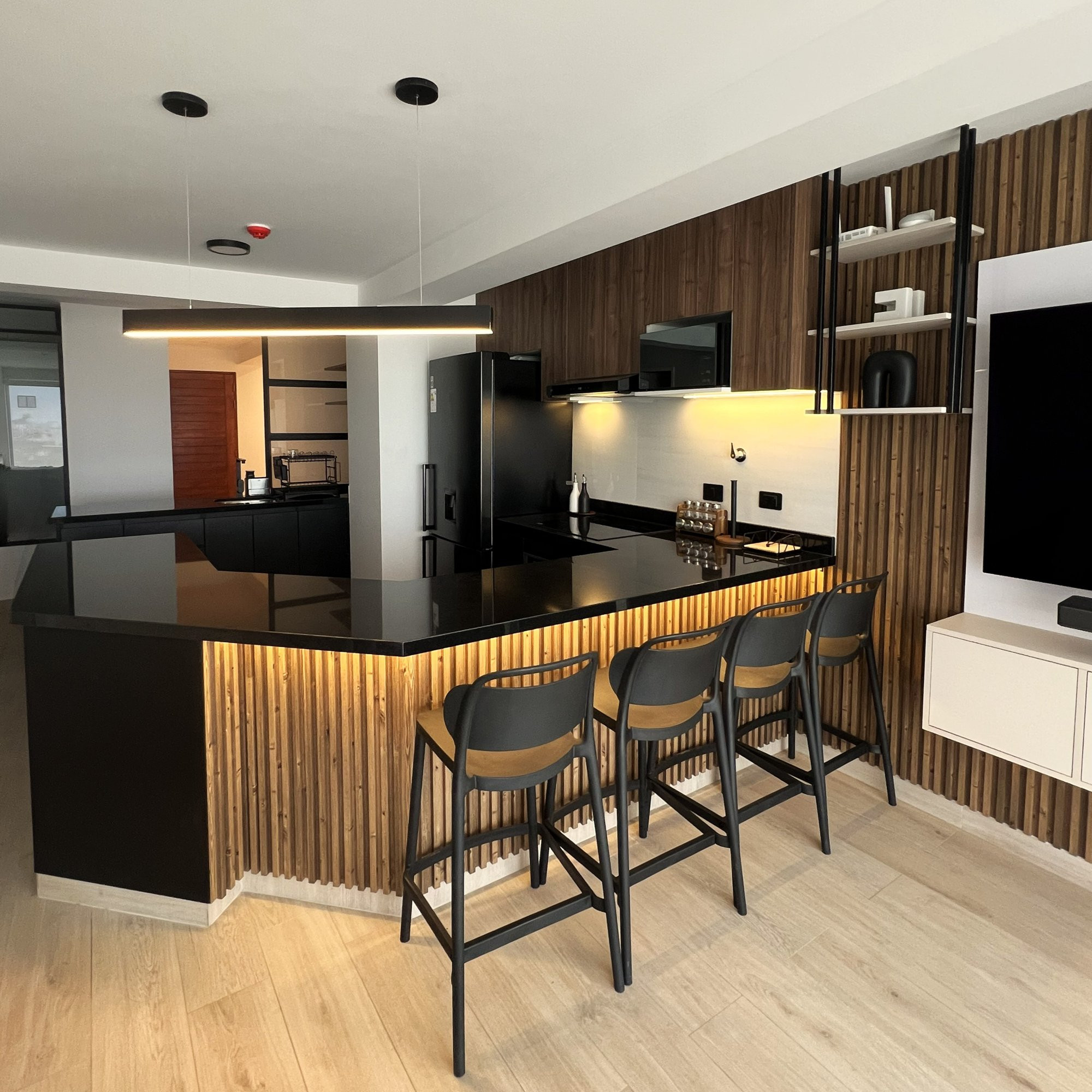 La ejecución incluyó la implementación de cocina con barra en granito negro, pintura y microcemento texturado, mobiliario completo en sala, dormitorios y baños, así como soluciones personalizadas las habitaciones. Diseño de habitación de niño con tapizado, escritorio integrado y cabecera. Se trabajó con un equipo técnico especializado en carpintería, acabados y supervisión de obra, utilizando cronogramas, valorizaciones y control constante.
