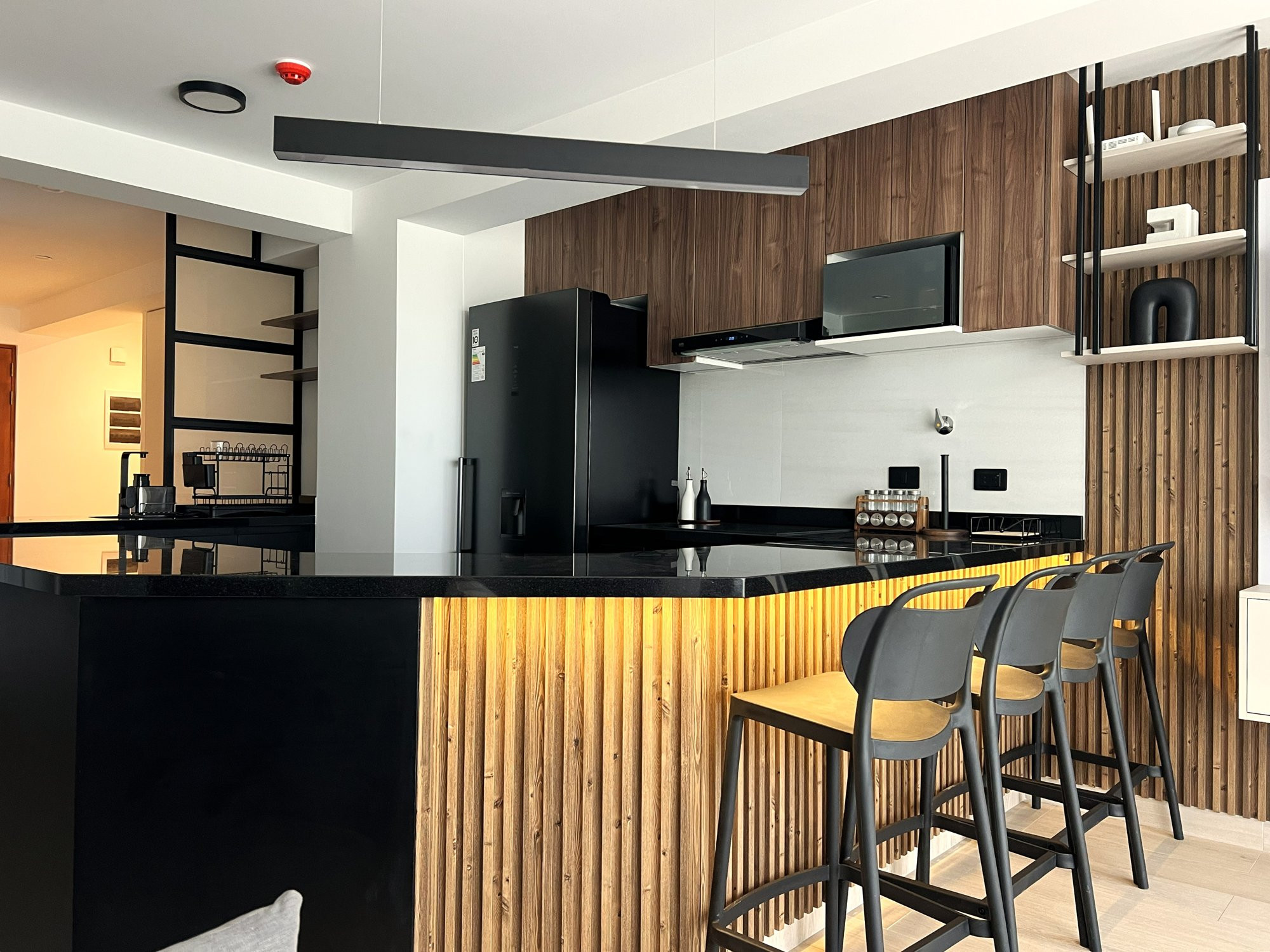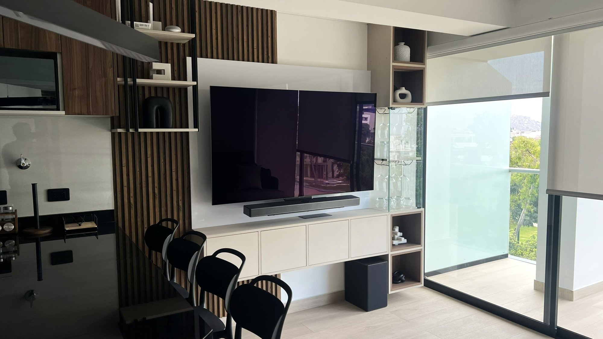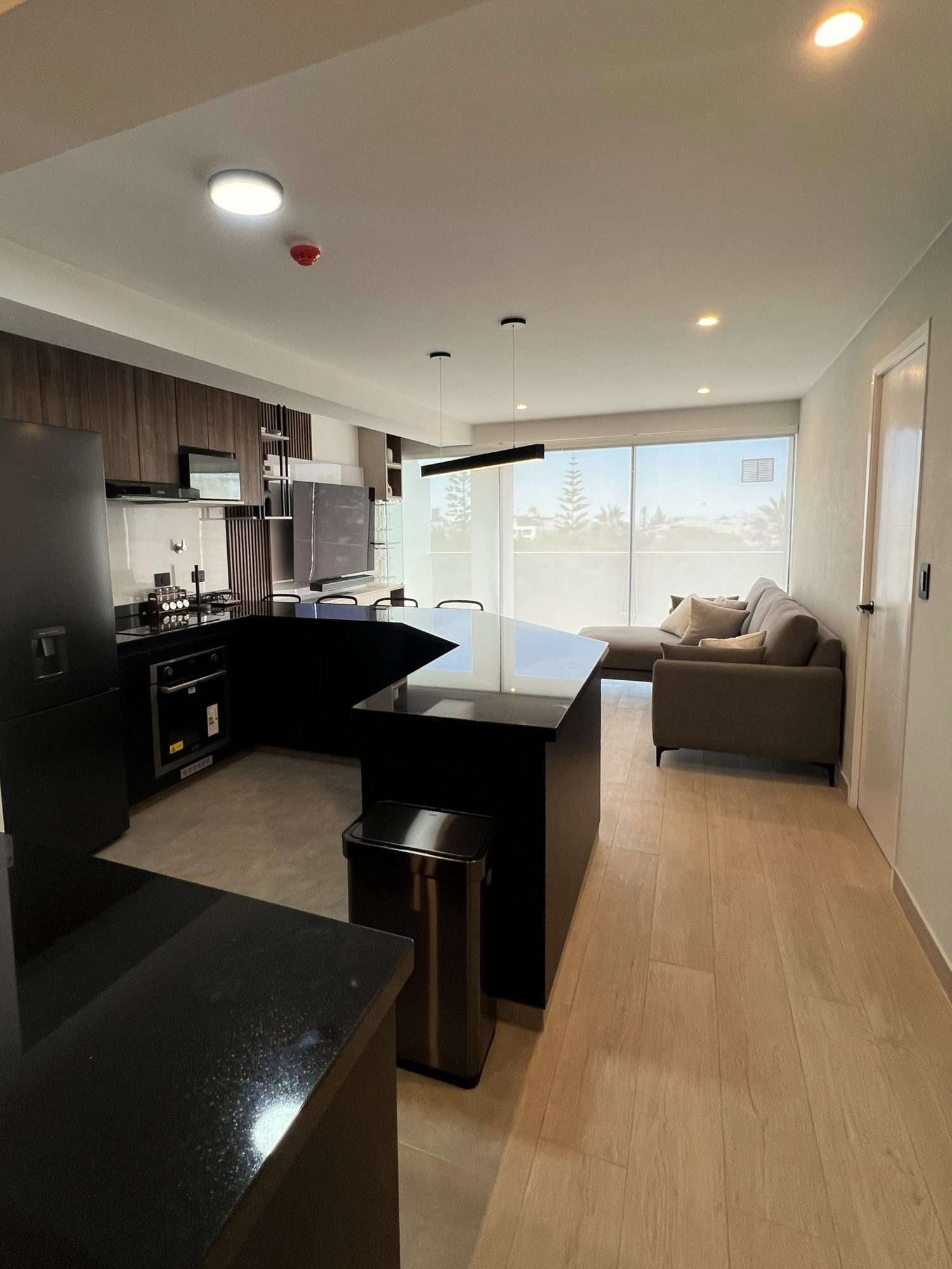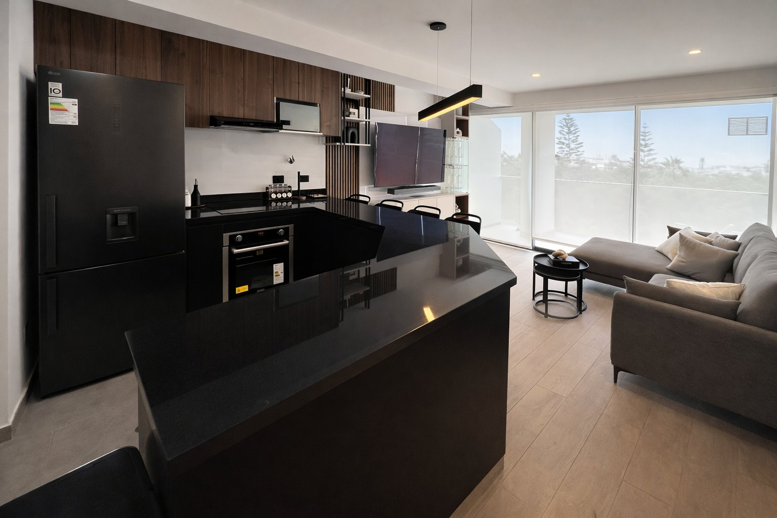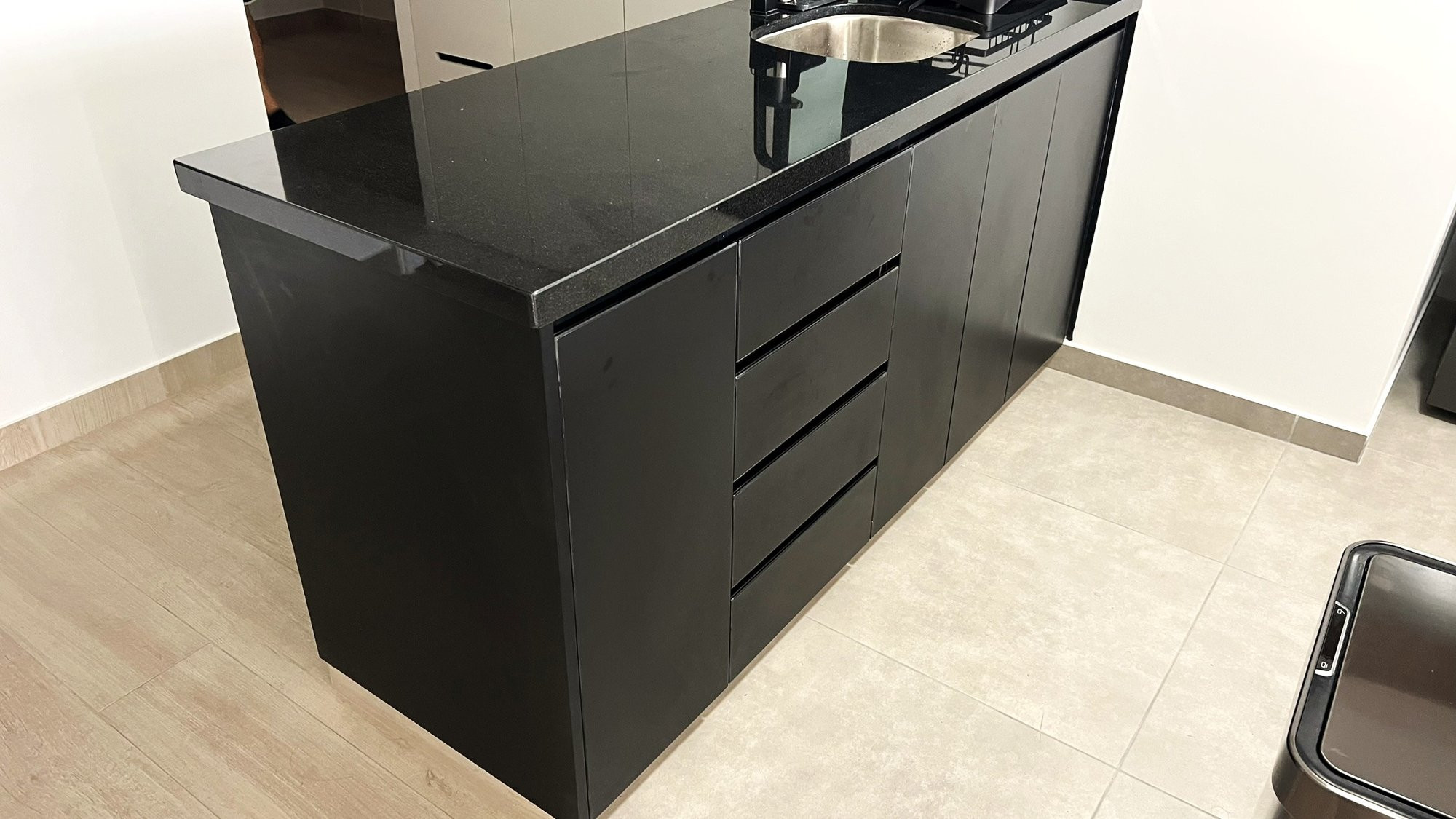 La ejecución incluyó la implementación de cocina con barra en granito negro, pintura y microcemento texturado, mobiliario completo en sala, dormitorios y baños, así como soluciones personalizadas las habitaciones. Diseño de habitación de niño con tapizado, escritorio integrado y cabecera. Se trabajó con un equipo técnico especializado en carpintería, acabados y supervisión de obra, utilizando cronogramas, valorizaciones y control constante.