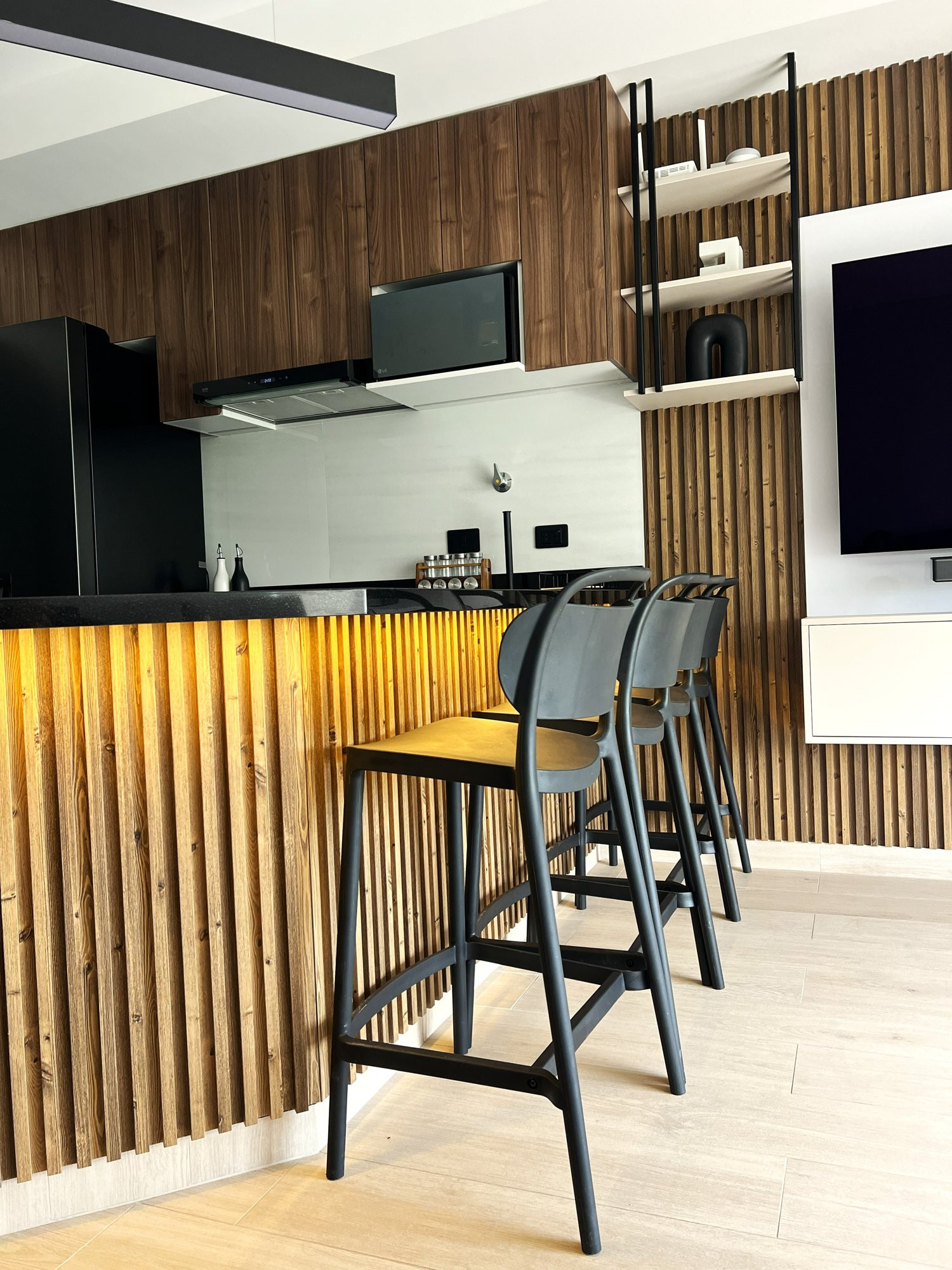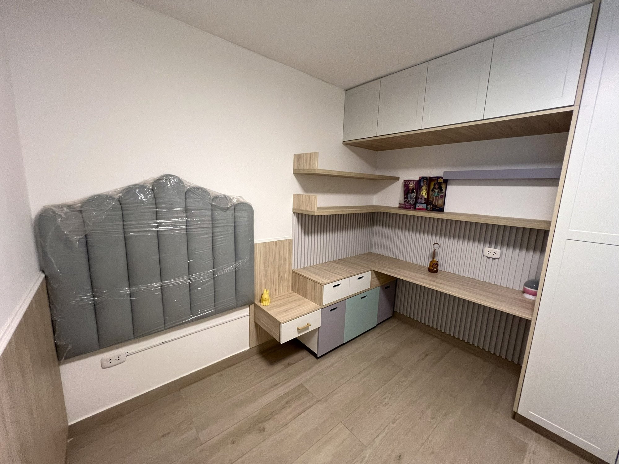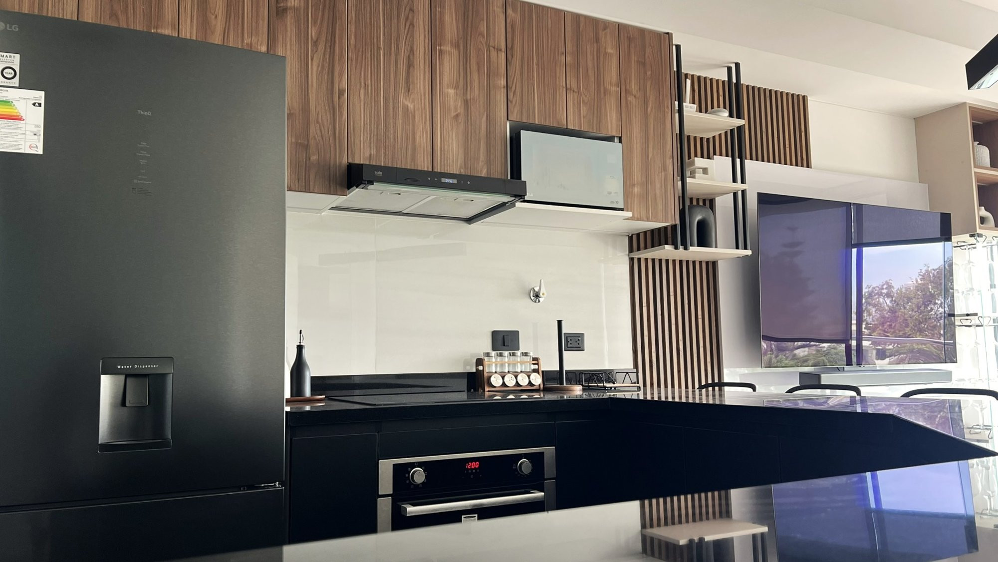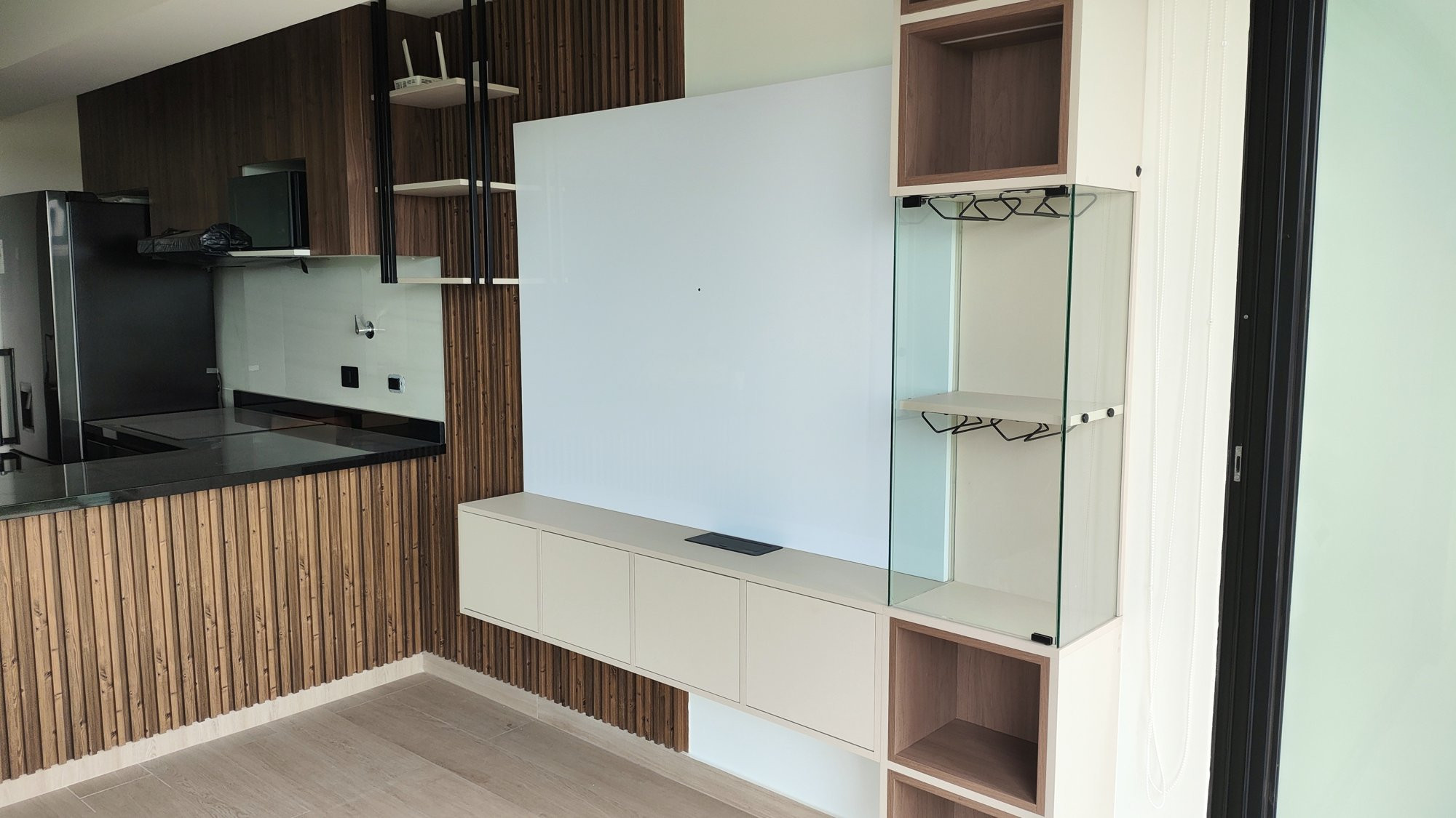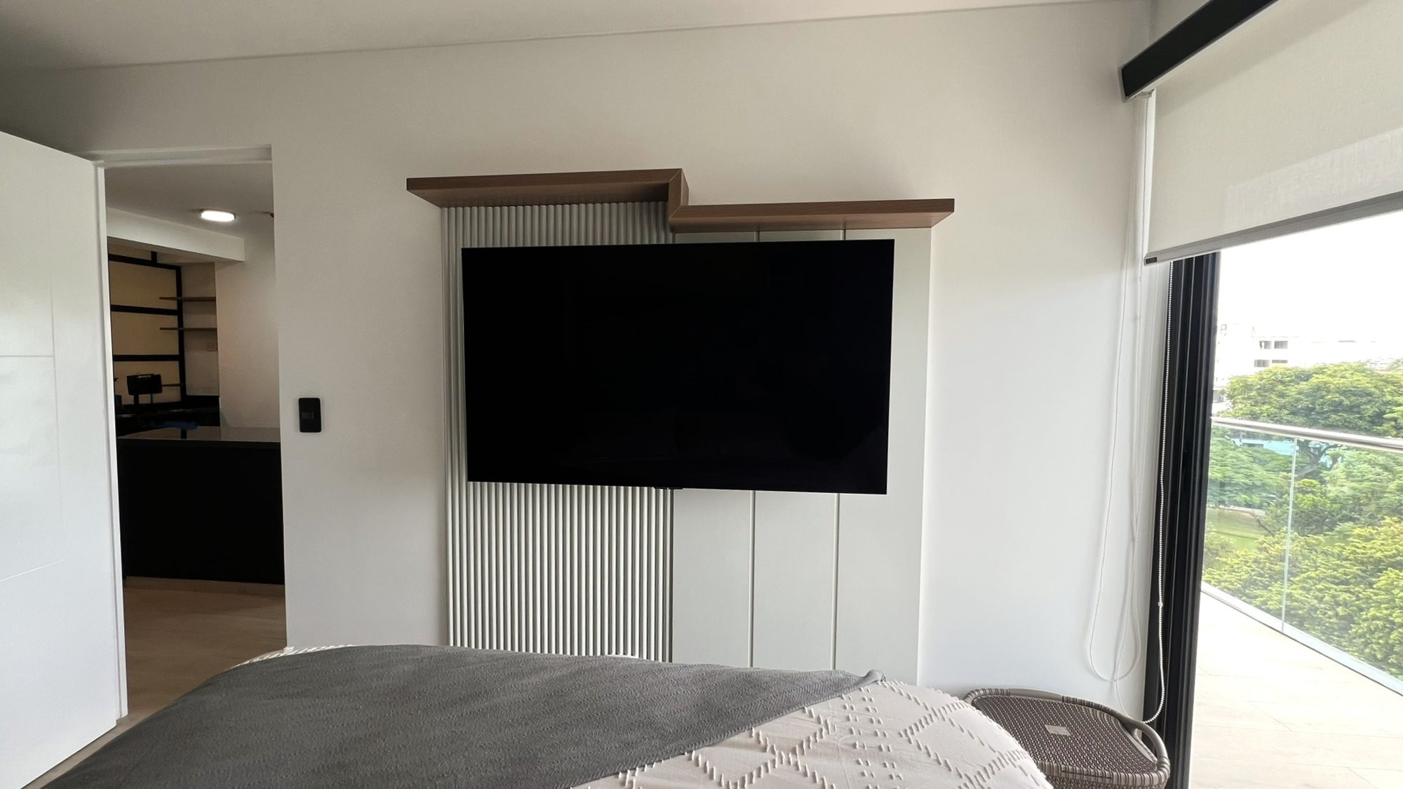La ejecución incluyó la implementación de cocina con barra en granito negro, pintura y microcemento texturado, mobiliario completo en sala, dormitorios y baños, así como soluciones personalizadas las habitaciones. Diseño de habitación de niño con tapizado, escritorio integrado y cabecera. Se trabajó con un equipo técnico especializado en carpintería, acabados y supervisión de obra, utilizando cronogramas, valorizaciones y control constante.