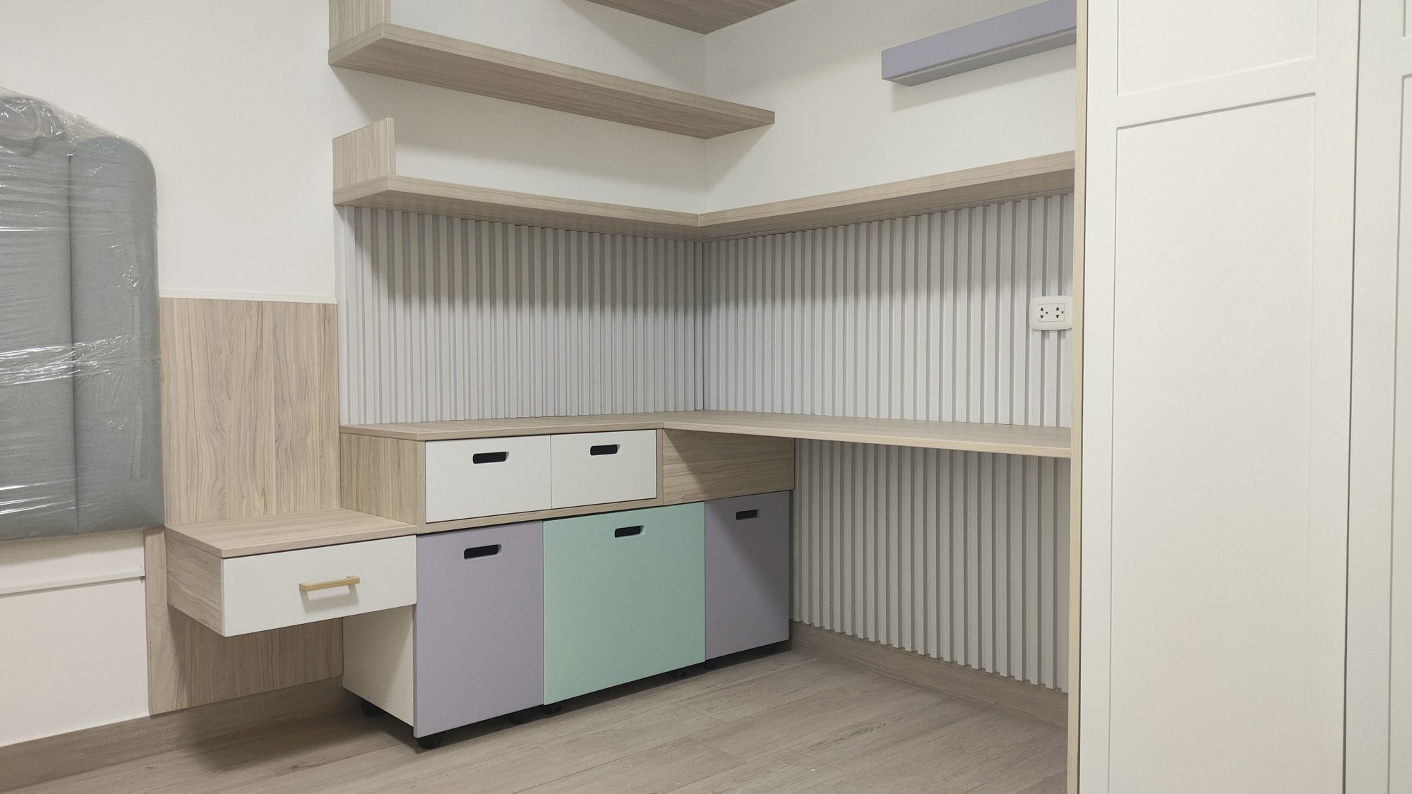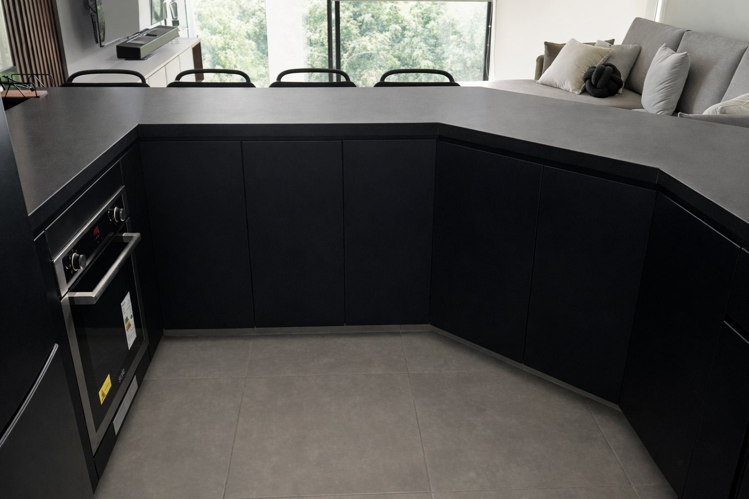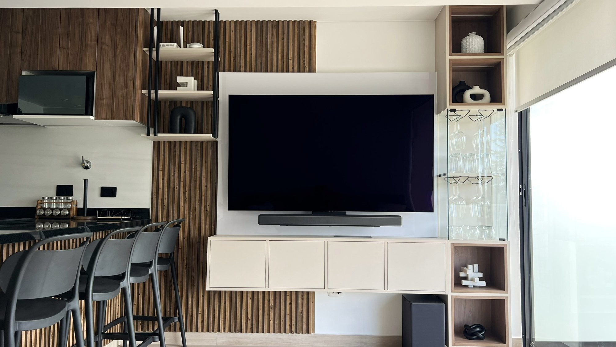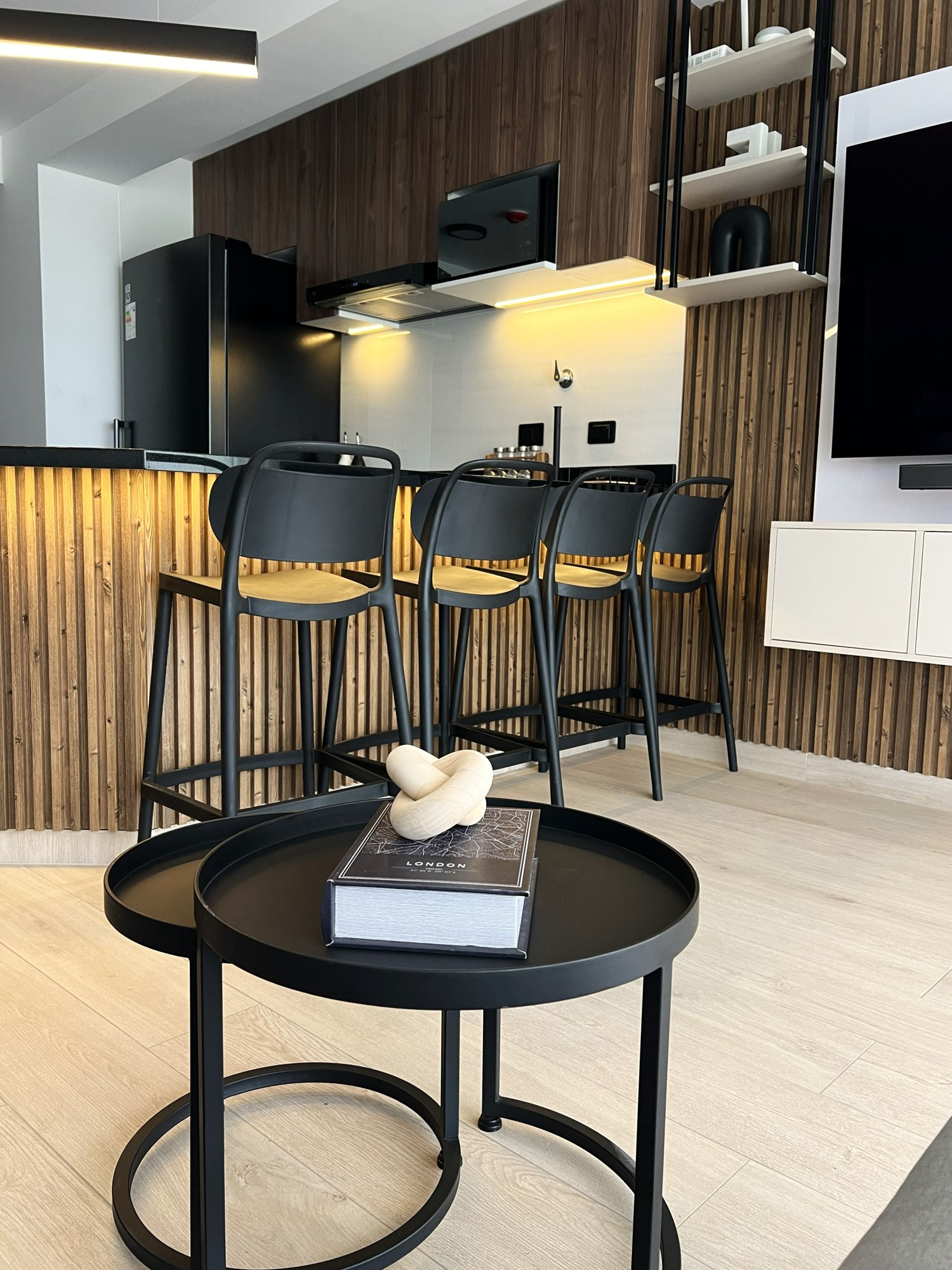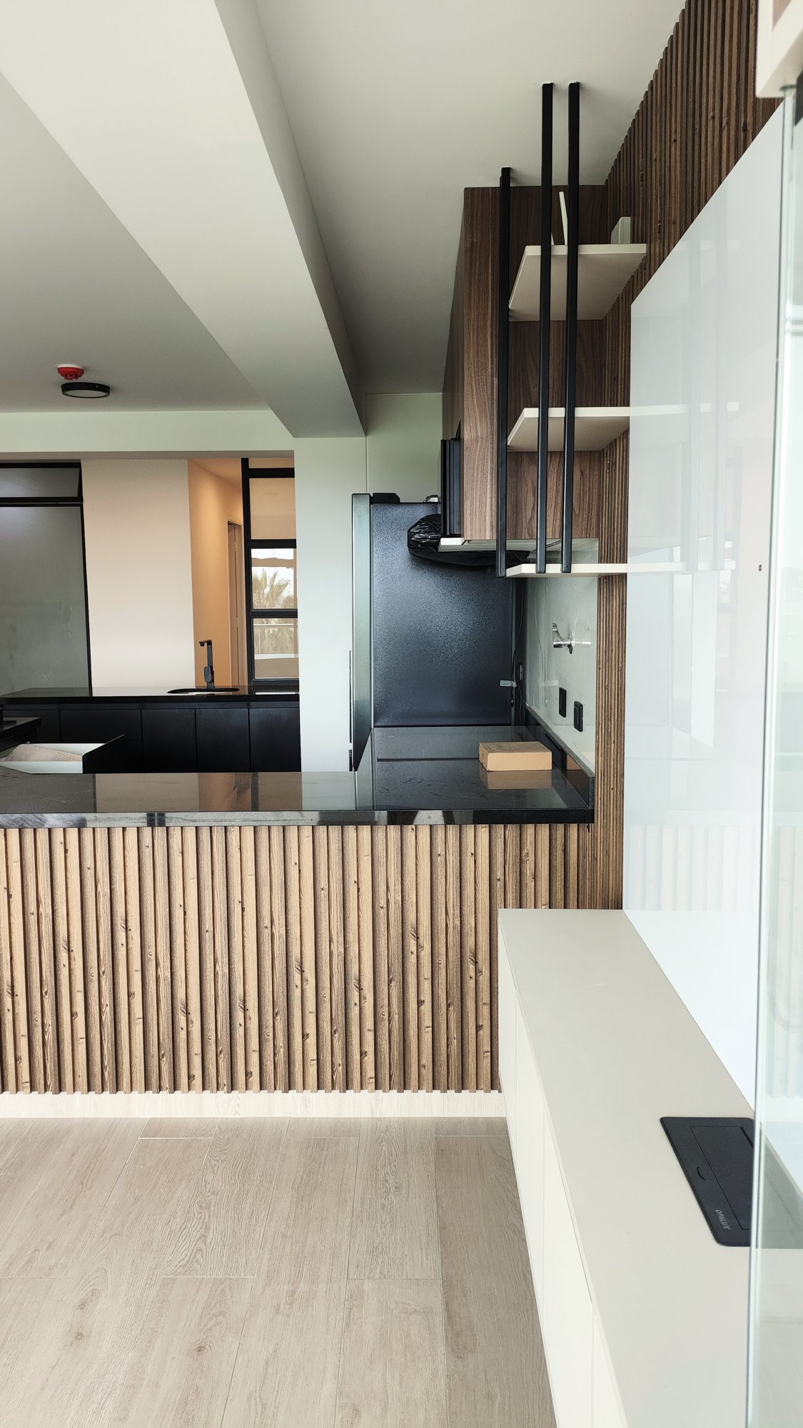 La ejecución incluyó la implementación de cocina con barra en granito negro, pintura y microcemento texturado, mobiliario completo en sala, dormitorios y baños, así como soluciones personalizadas las habitaciones. Diseño de habitación de niño con tapizado, escritorio integrado y cabecera. Se trabajó con un equipo técnico especializado en carpintería, acabados y supervisión de obra, utilizando cronogramas, valorizaciones y control constante.