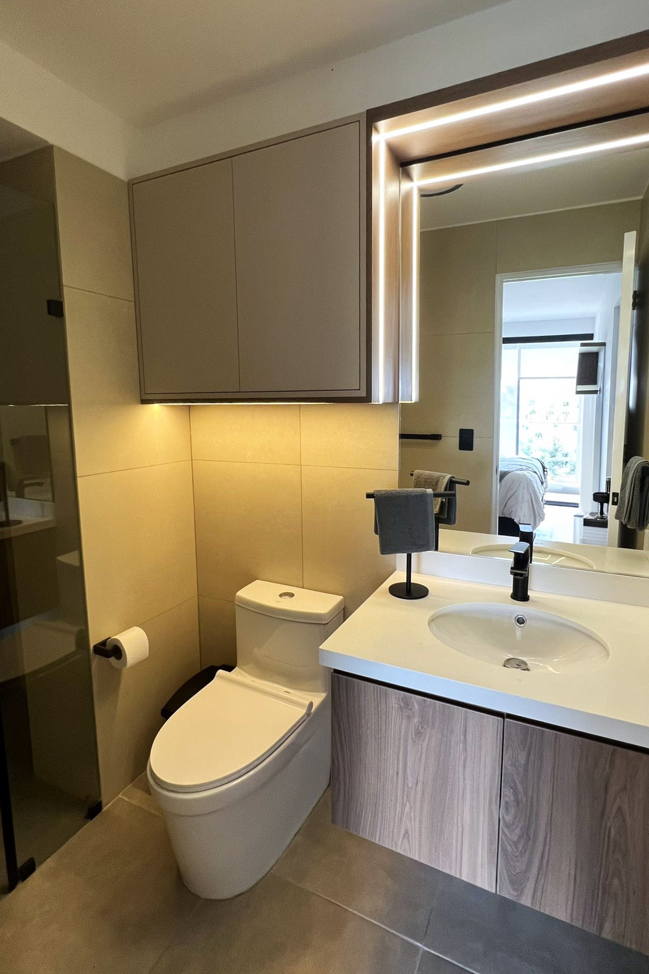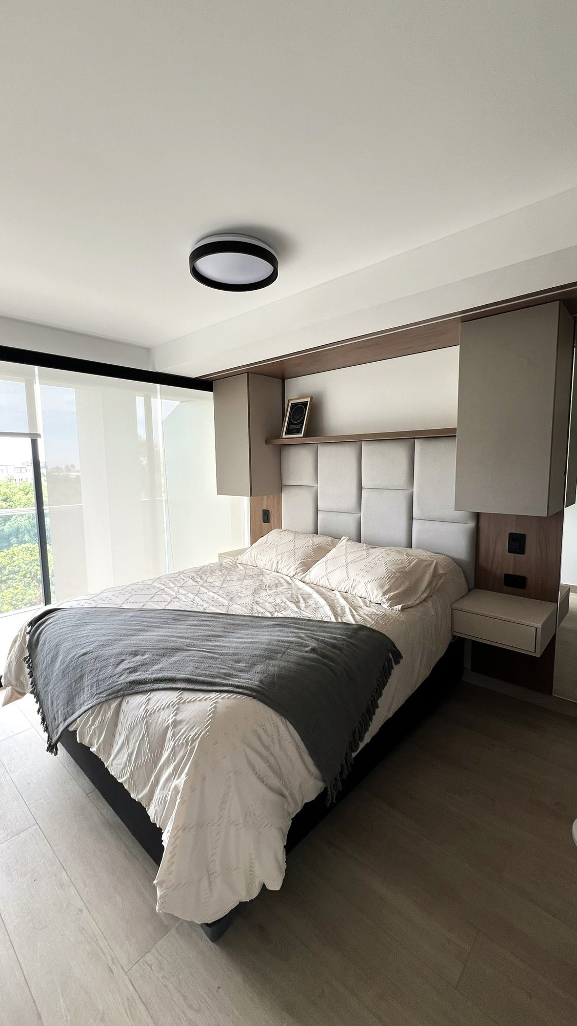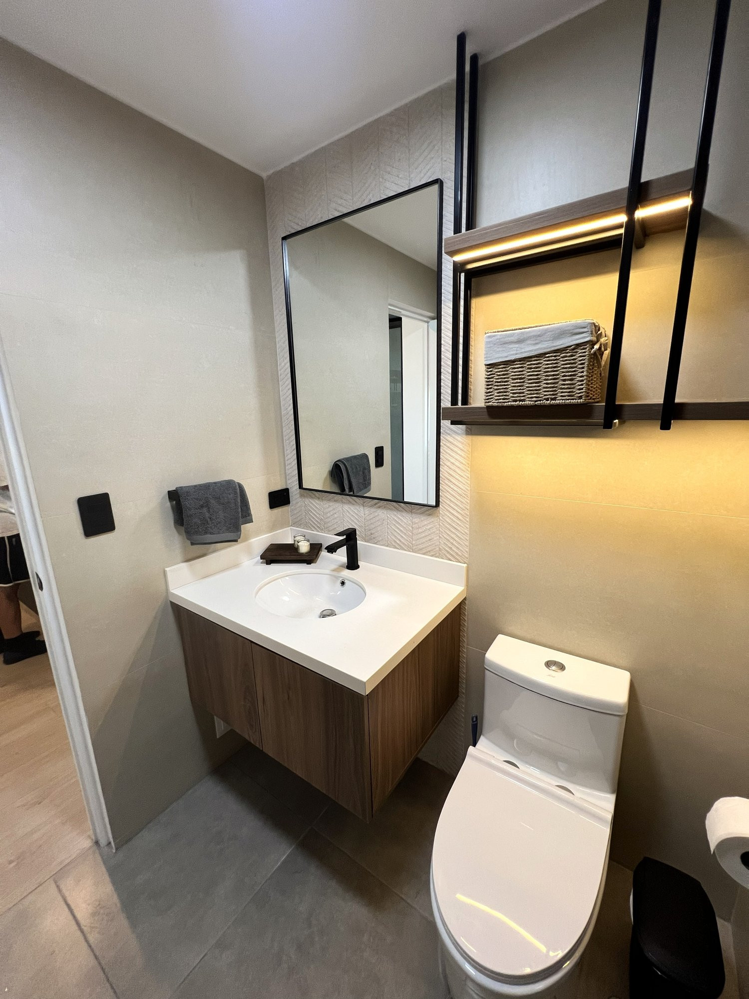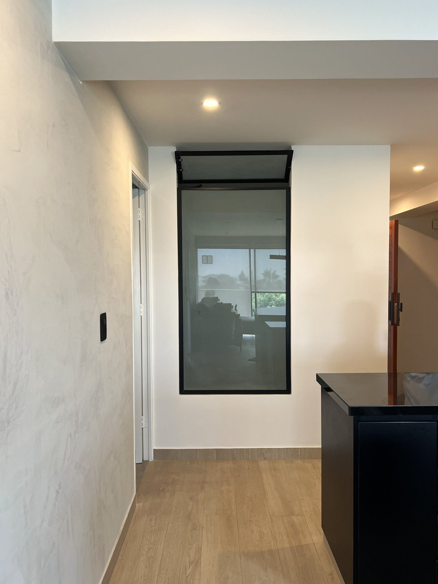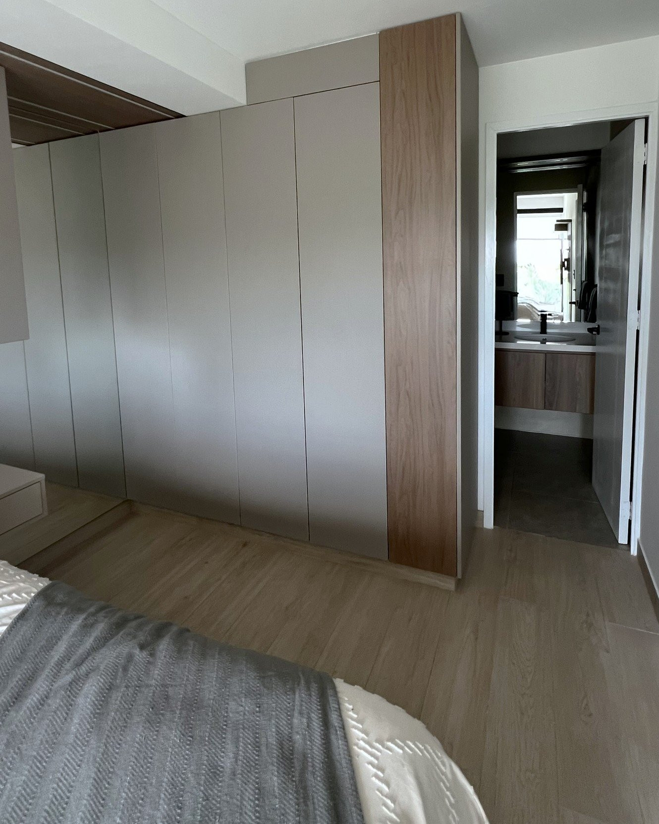 El proyecto se planteó como una intervención integral con enfoque en diseño funcional y alto valor estético, incorporando mobiliario en melamina, MDF pintado en poliuretano, granito negro y acabados como microcemento texturado y pintura. El valor añadido se centró en maximizar cada metro cuadrado mediante soluciones a medida, modificación de closets para implementar nuevos muebles a pedido del cliente, integración de iluminación y acabados según gustos del cliente.