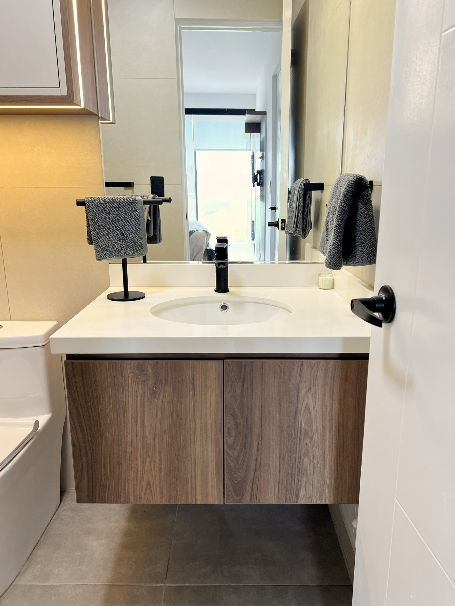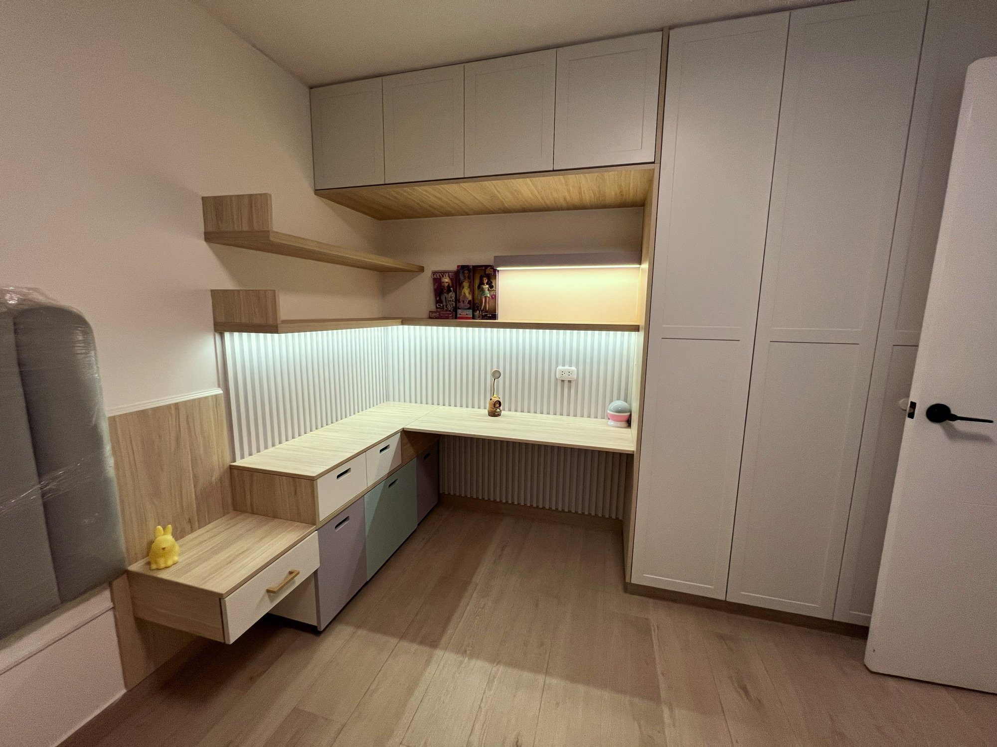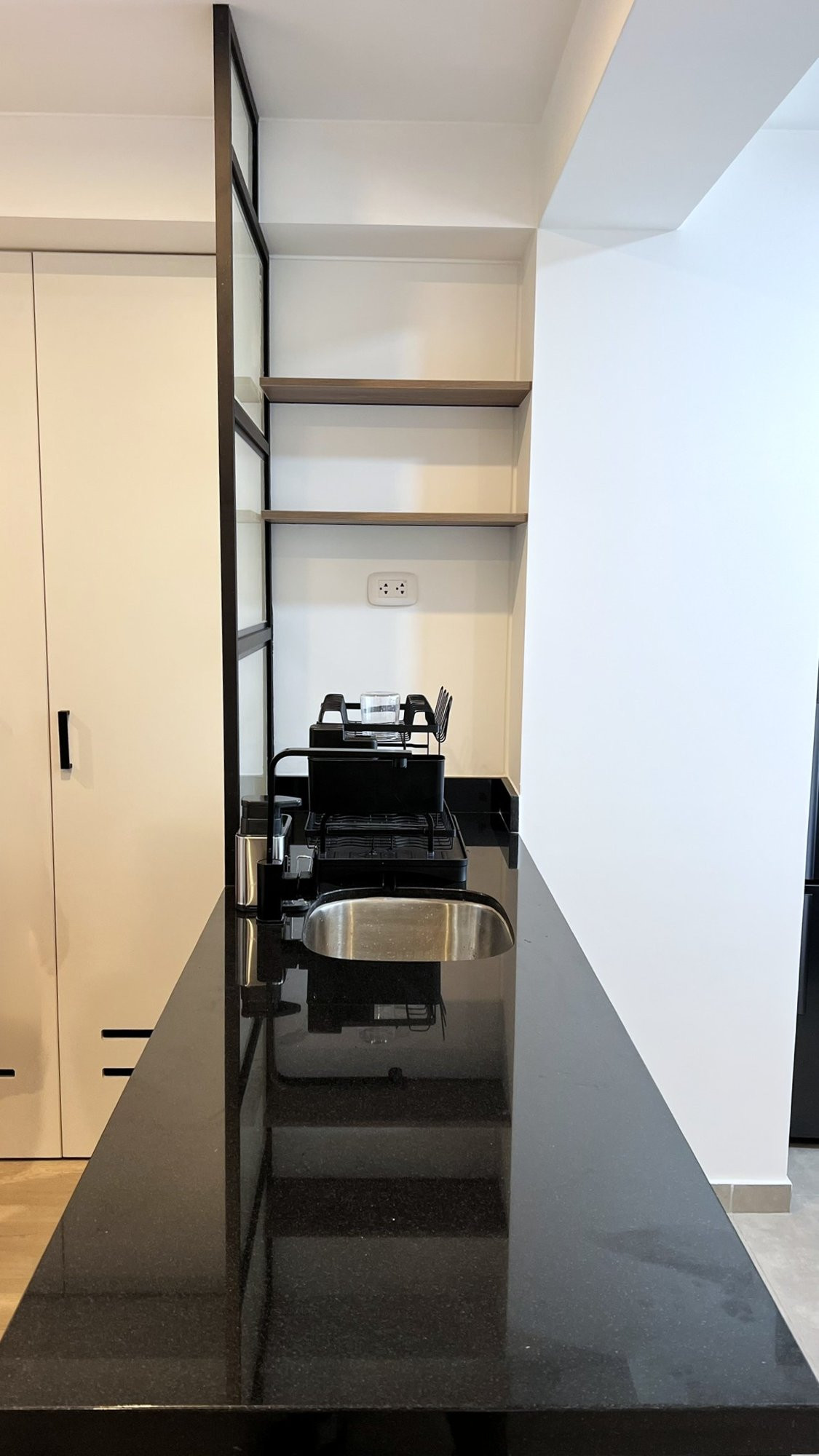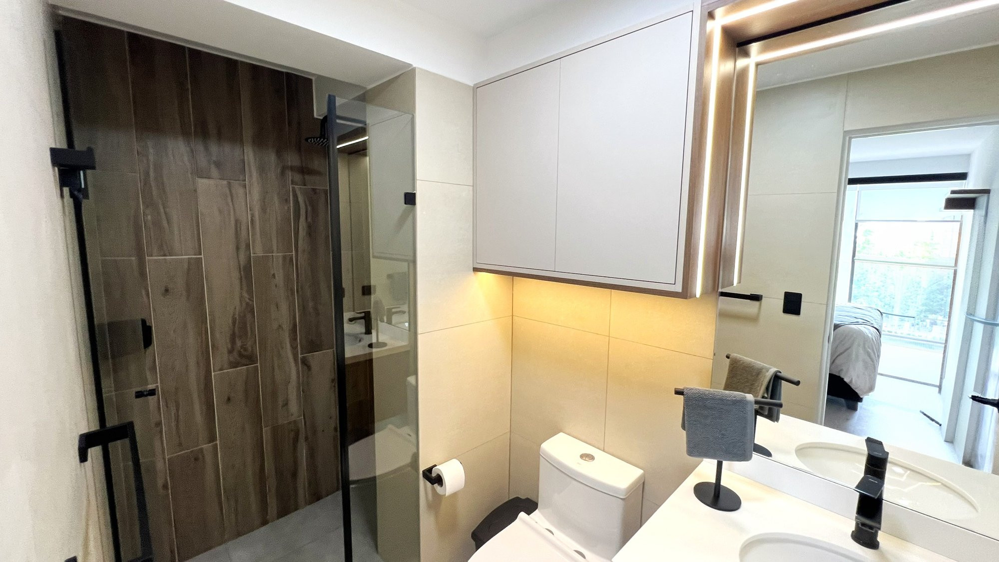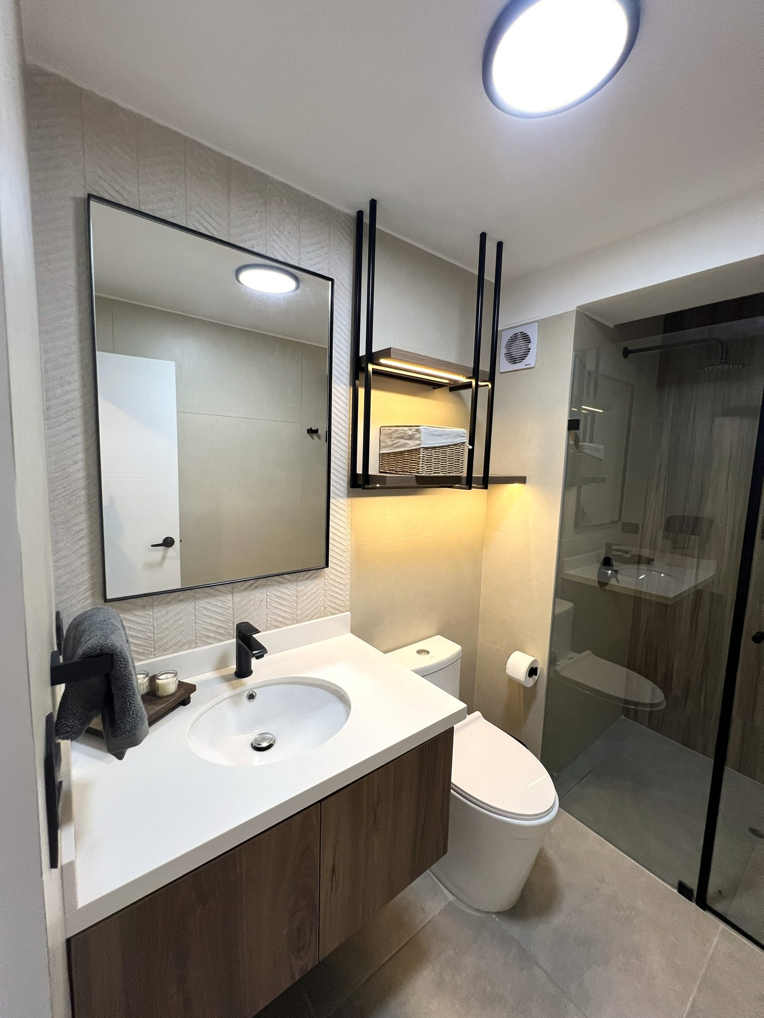 El proyecto se planteó como una intervención integral con enfoque en diseño funcional y alto valor estético, incorporando mobiliario en melamina, MDF pintado en poliuretano, granito negro y acabados como microcemento texturado y pintura. El valor añadido se centró en maximizar cada metro cuadrado mediante soluciones a medida, modificación de closets para implementar nuevos muebles a pedido del cliente, integración de iluminación y acabados según gustos del cliente.