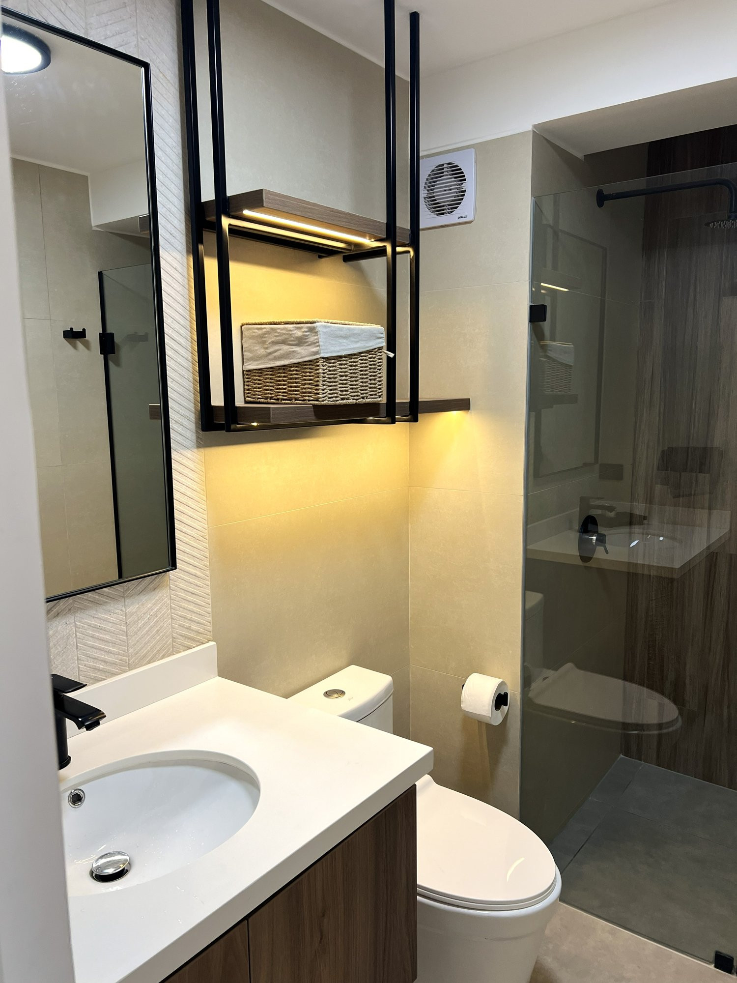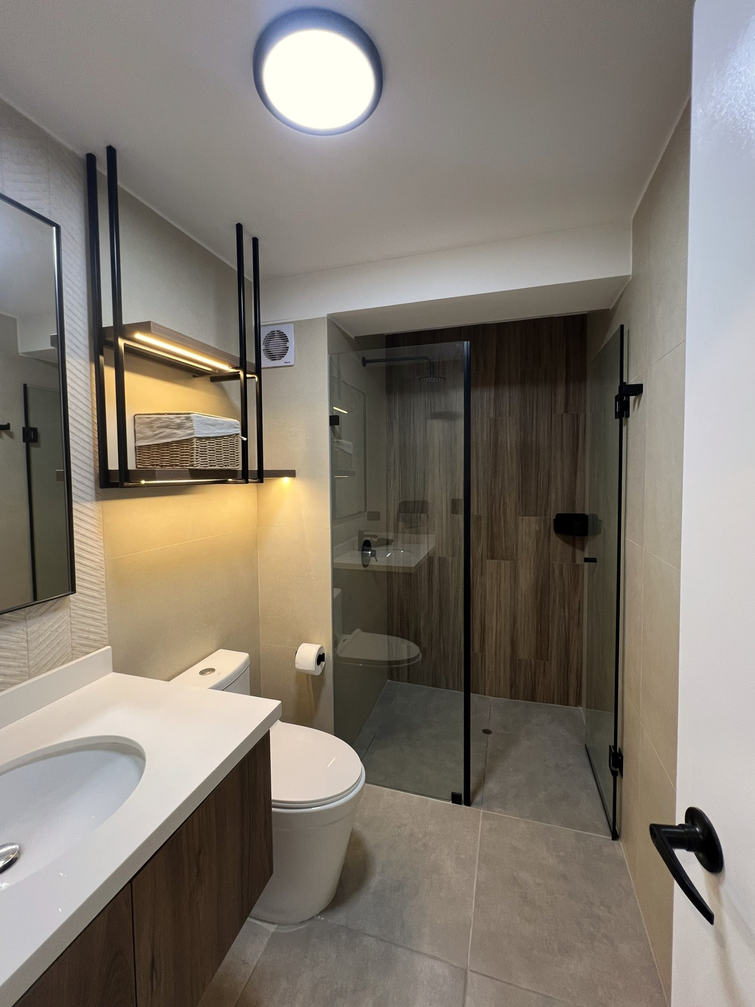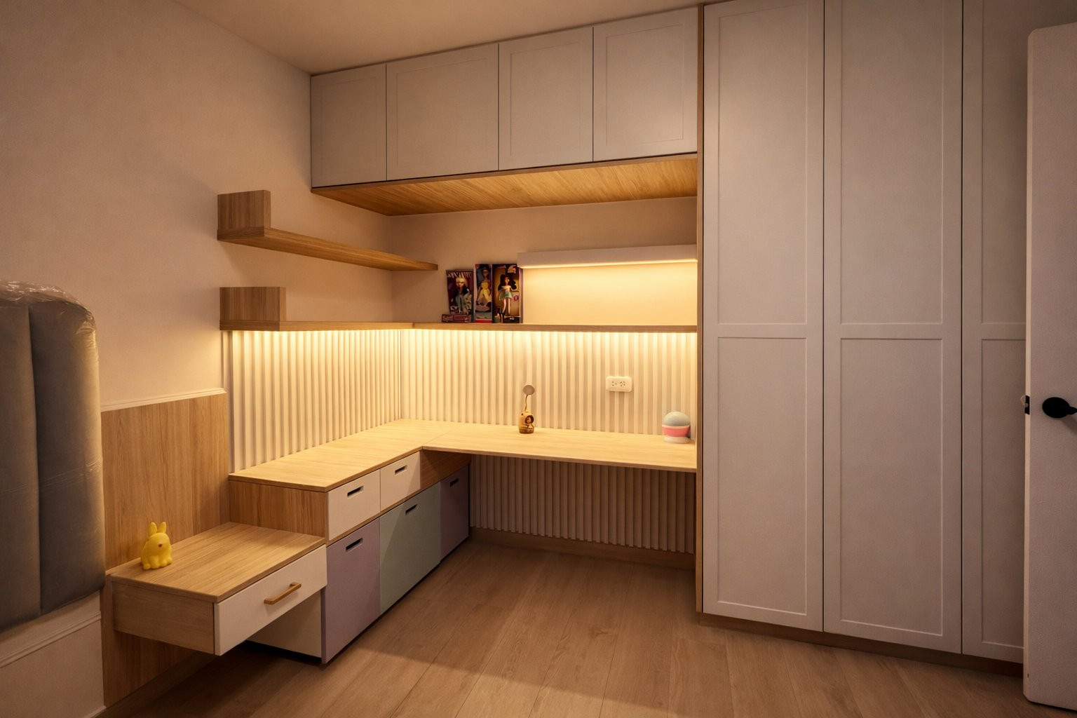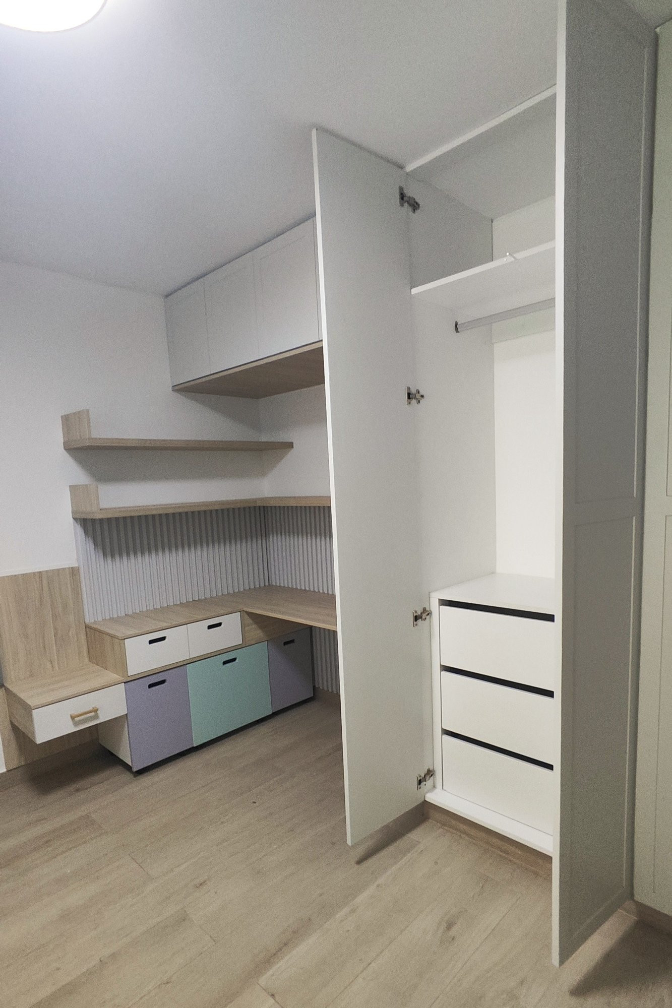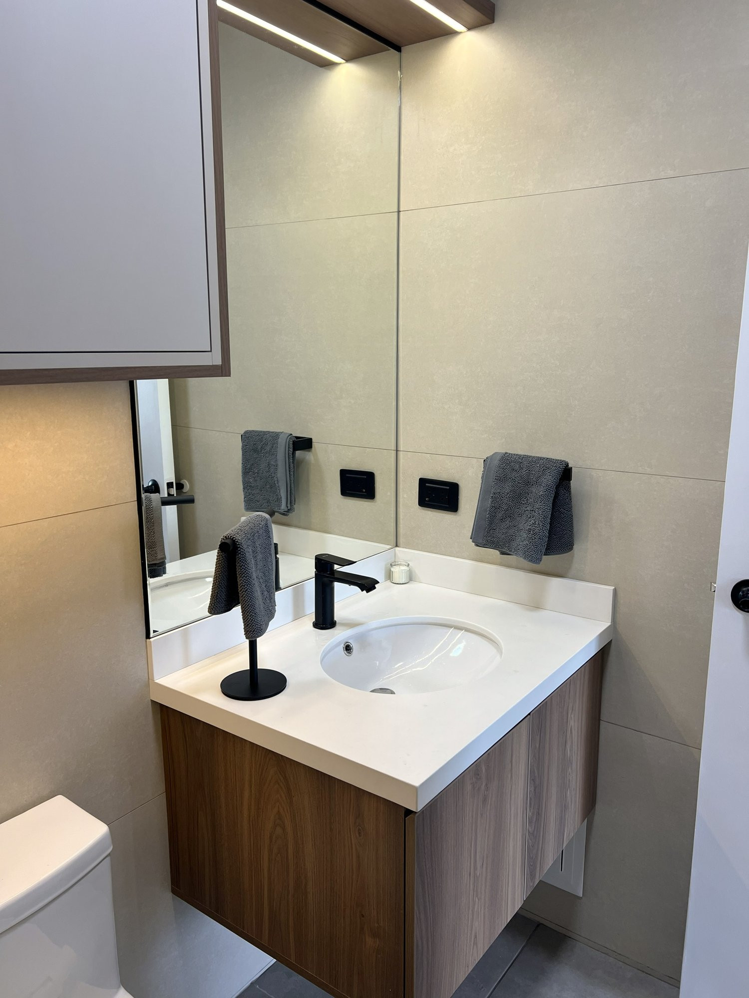 El proyecto se planteó como una intervención integral con enfoque en diseño funcional y alto valor estético, incorporando mobiliario en melamina, MDF pintado en poliuretano, granito negro y acabados como microcemento texturado y pintura. El valor añadido se centró en maximizar cada metro cuadrado mediante soluciones a medida, modificación de closets para implementar nuevos muebles a pedido del cliente, integración de iluminación y acabados según gustos del cliente.