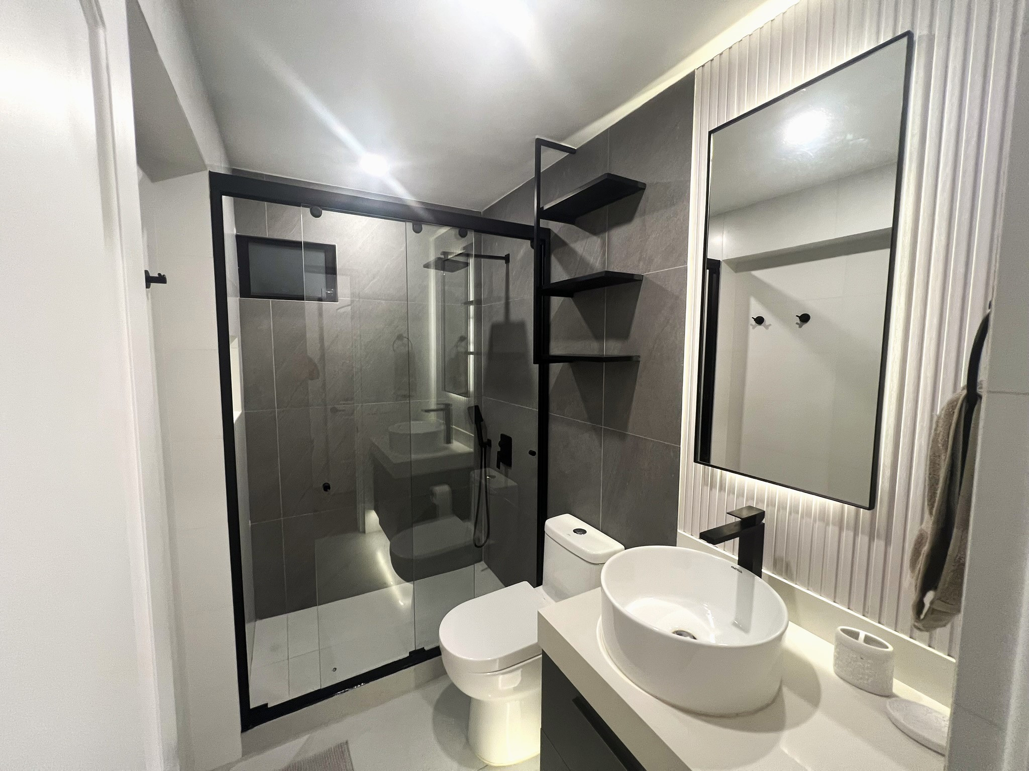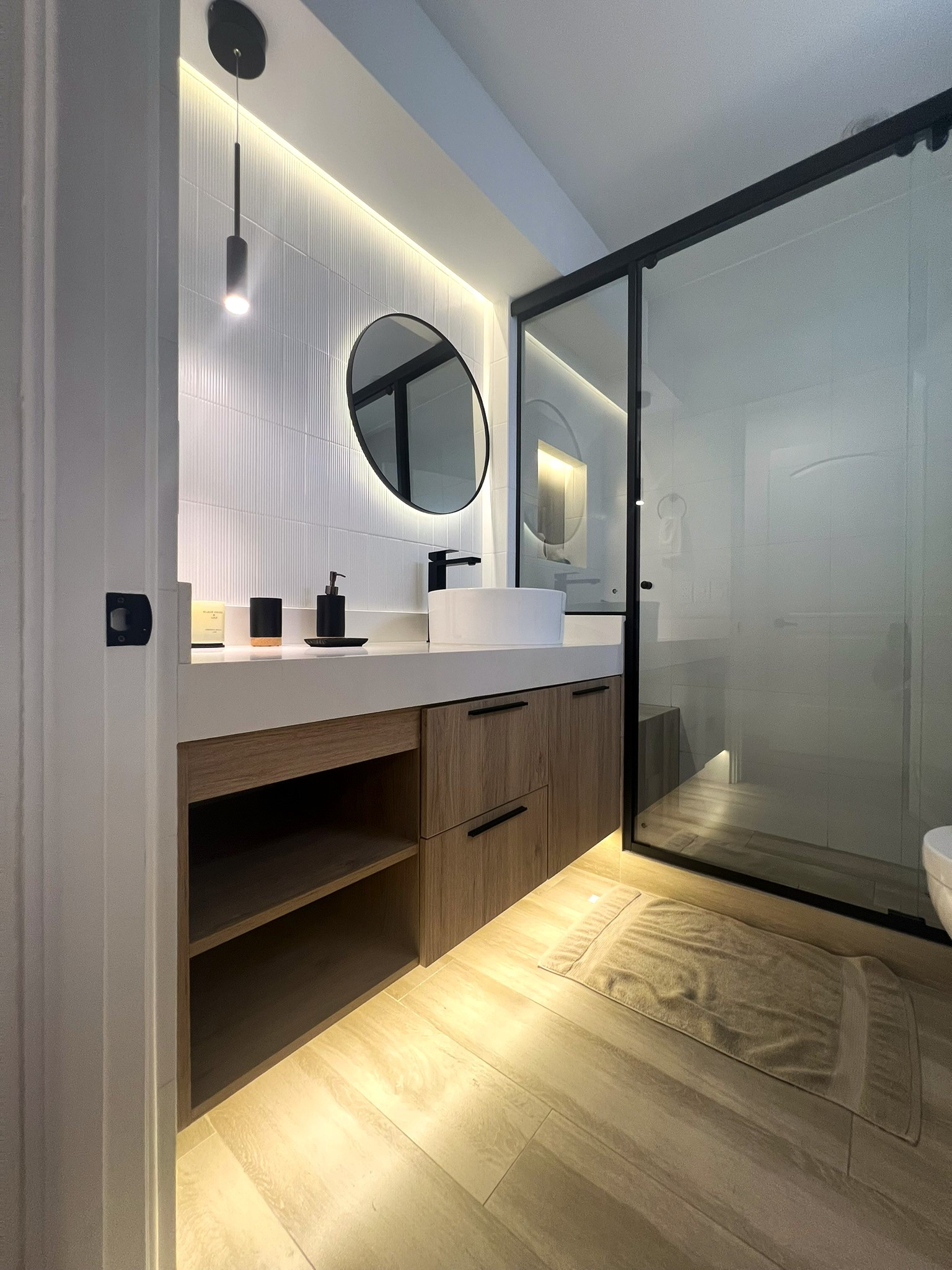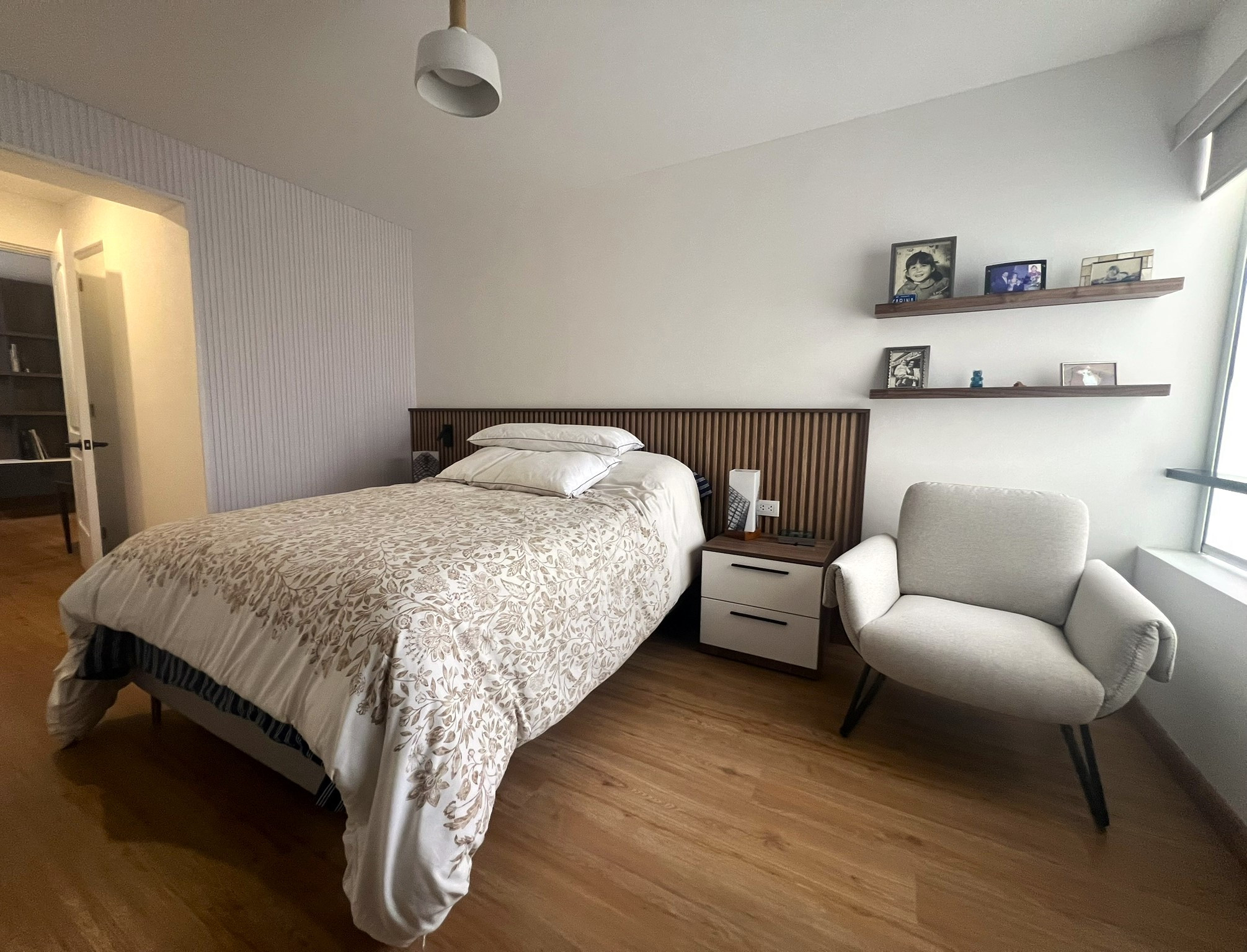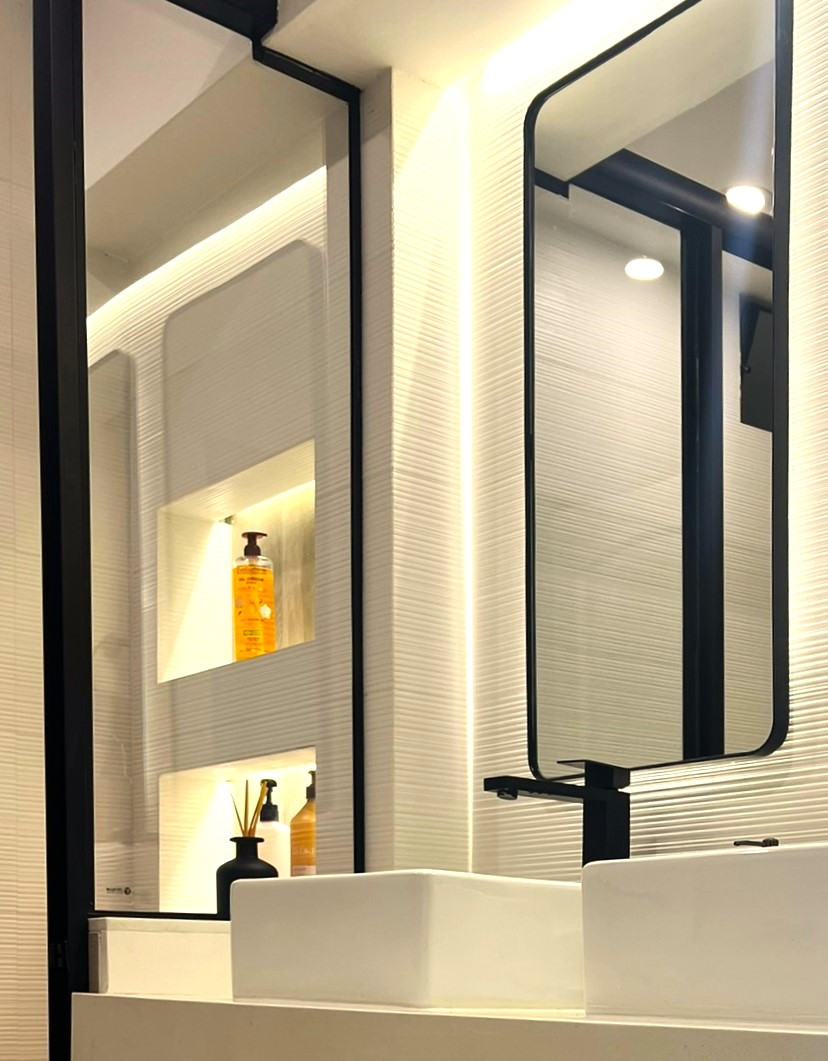El proyecto incluyó la instalación de porcelanatos, enchapes y grifería moderna en baños, así como la fabricación de muebles a medida en melamina y MDF pintado, garantizando funcionalidad y durabilidad. Se ejecutaron trabajos de pintura, tapicería, instalación de accesorios, mejoras eléctricas menores y el revestimiento de chimenea, logrando una remodelación integral con acabados contemporáneos. La correcta coordinación de obra y el control técnico permitieron una ejecución ordenada, adaptable a ajustes durante el proceso y alineada a estándares profesionales de diseño interior y construcción. Trabajar con la Sra. Grithis ha sido un placer, muchas gracias por la confianza y paciencia.