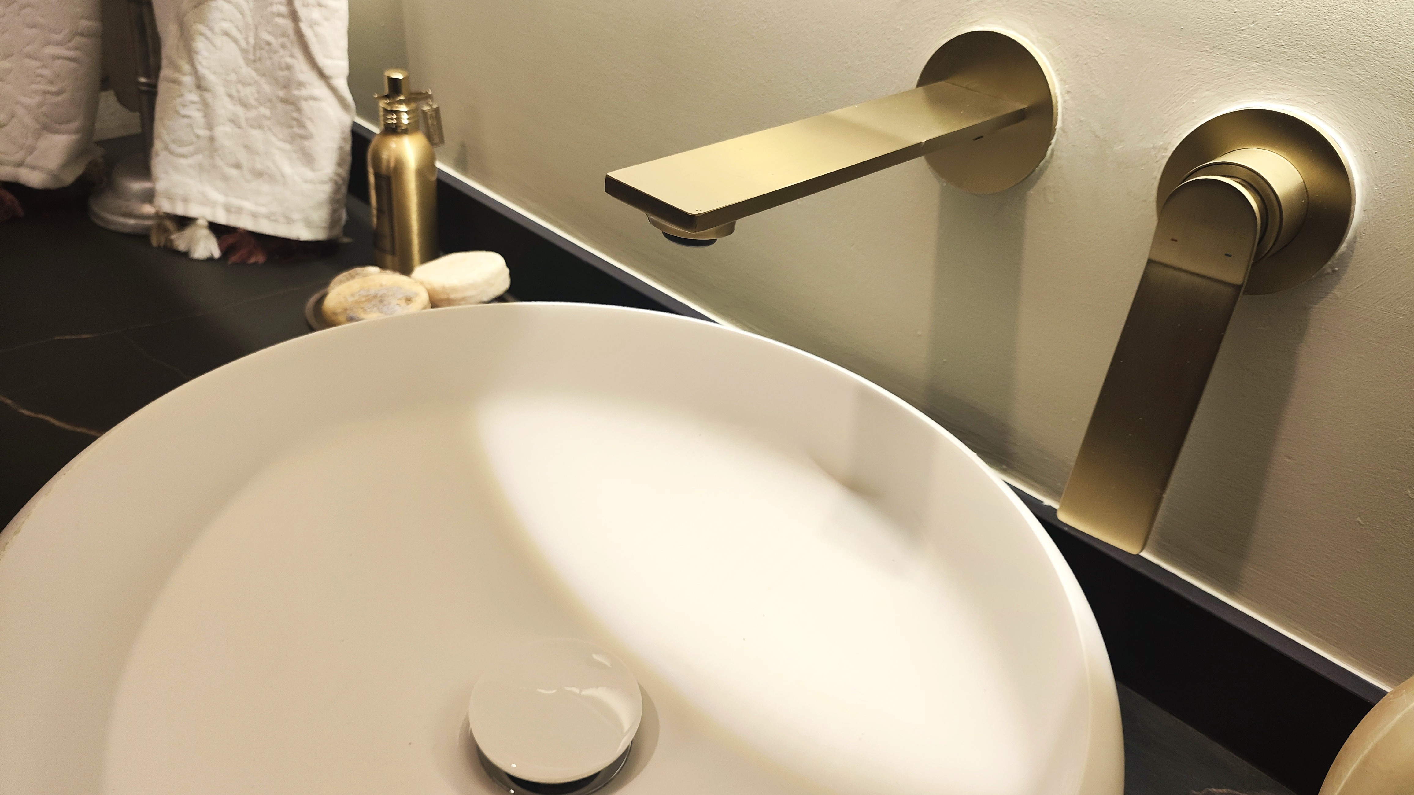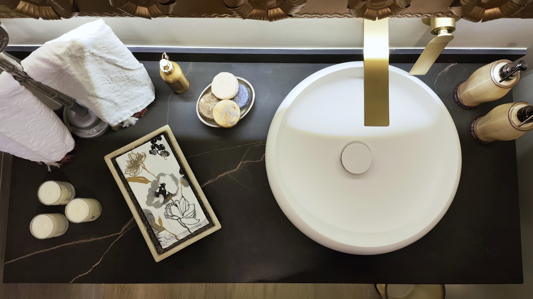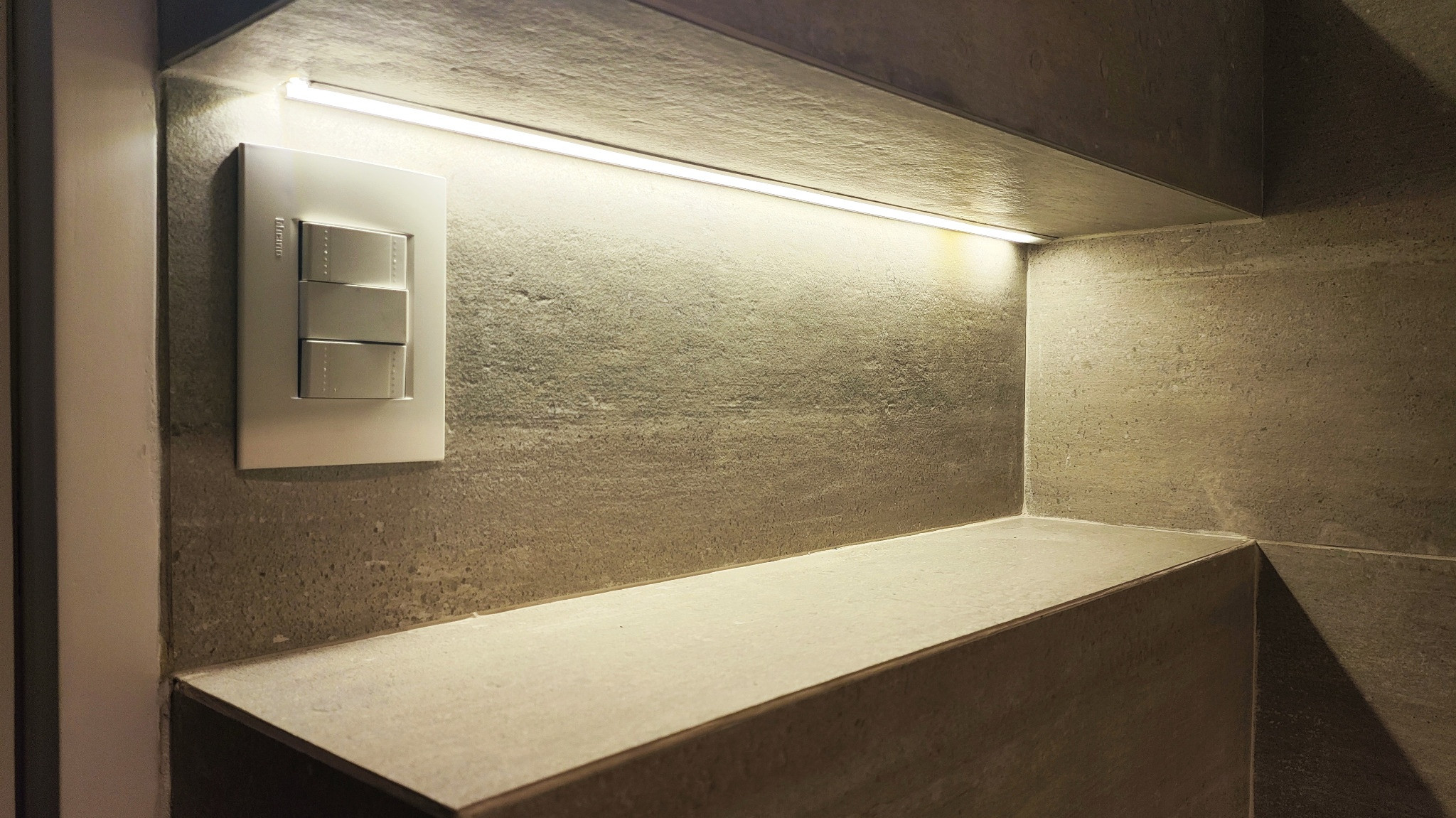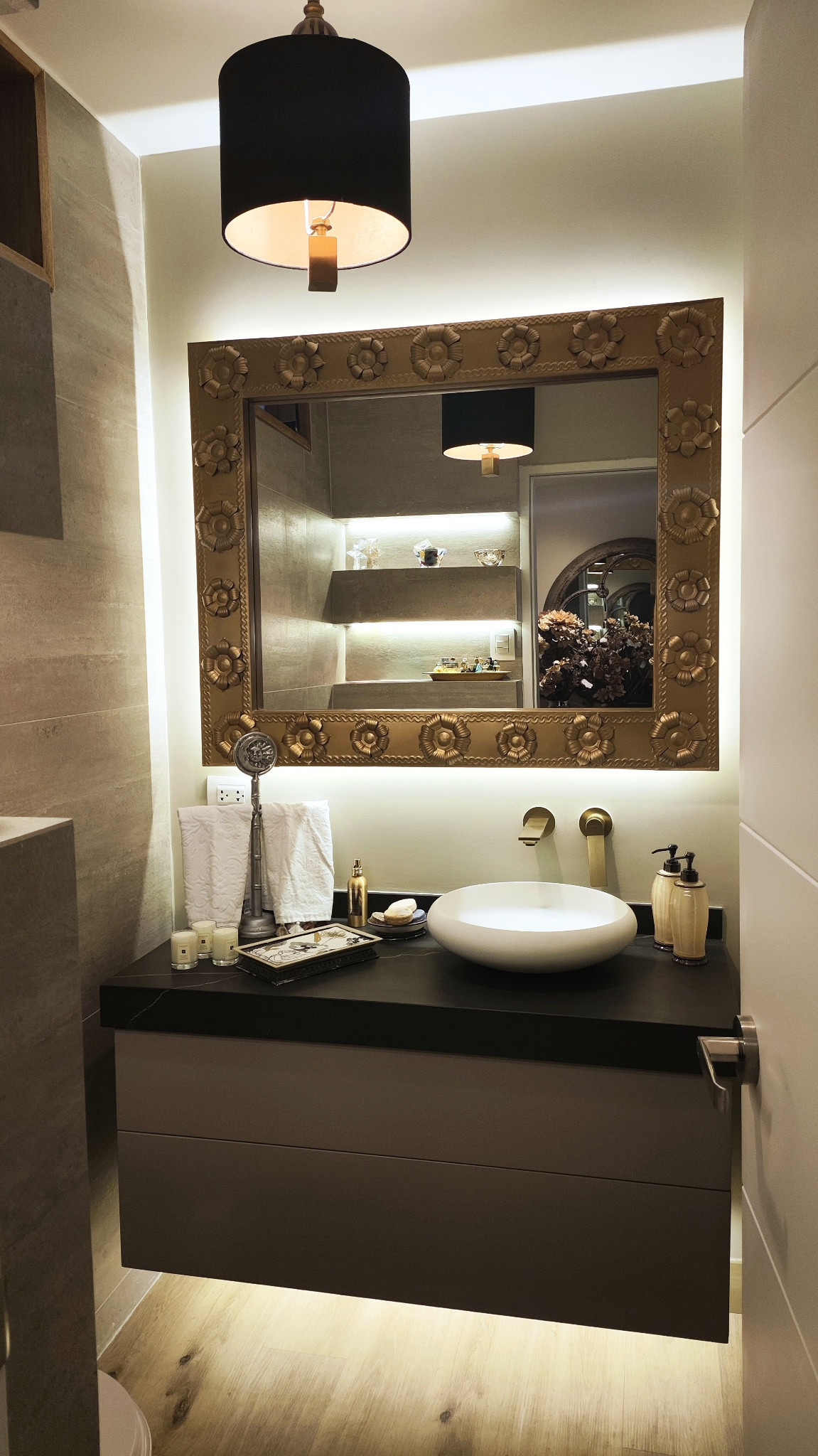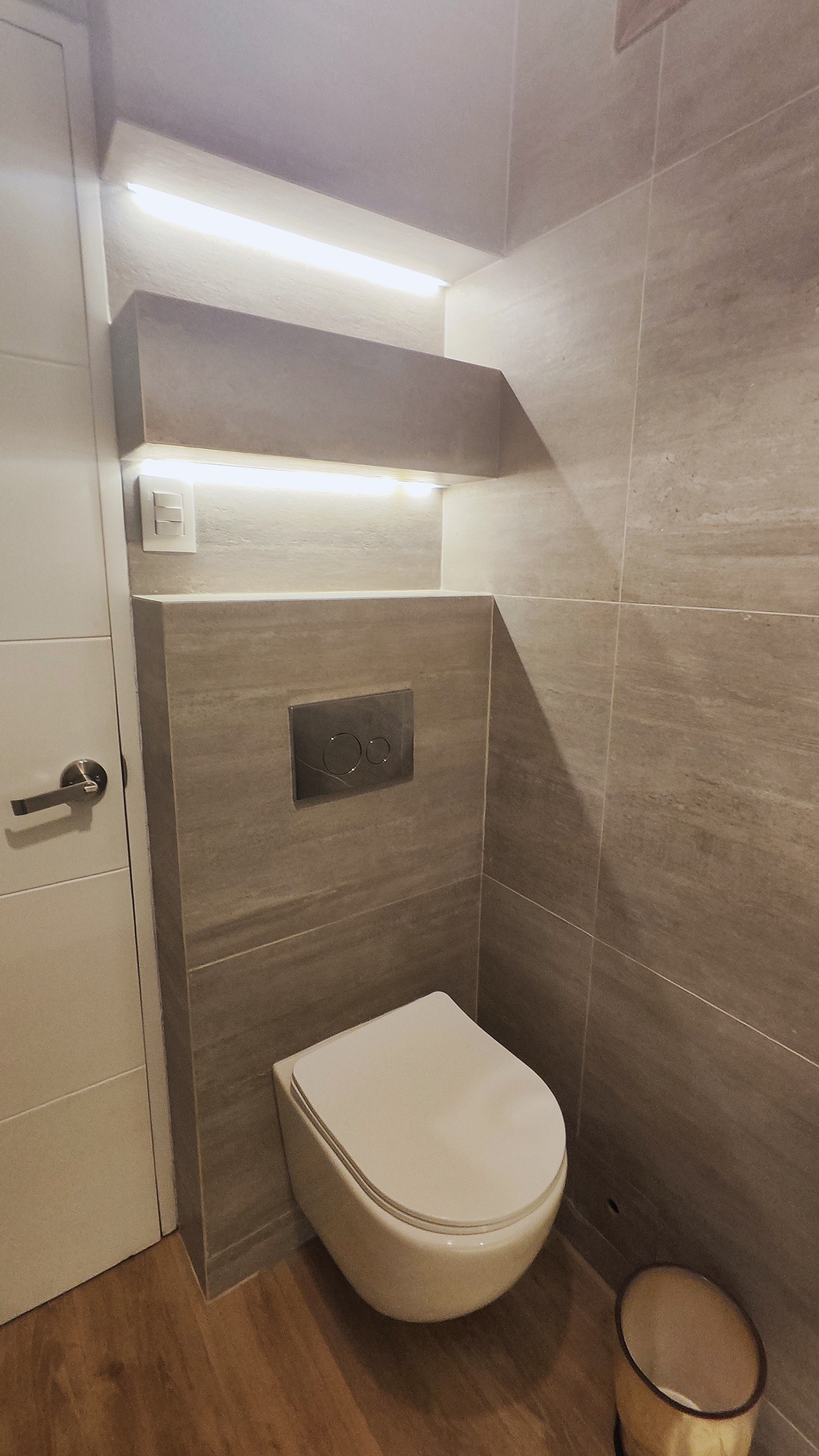 En el baño de visitas, se rediseñó la distribución, incorporando un inodoro suspendido, mueble en MDF pintado con encimera de piedra sinterizada, hornacina, mueble retroiluminado y espejo a medida.