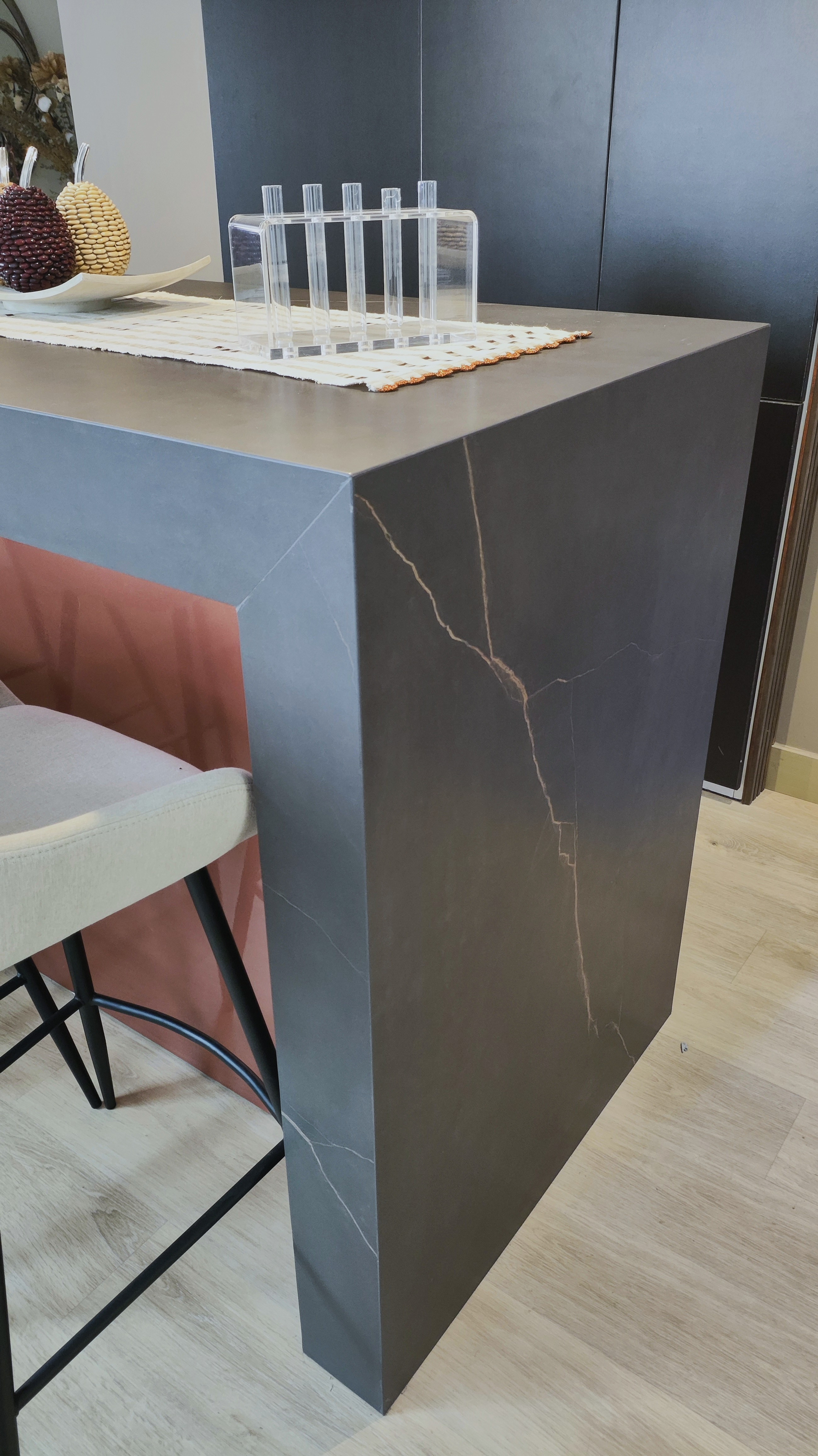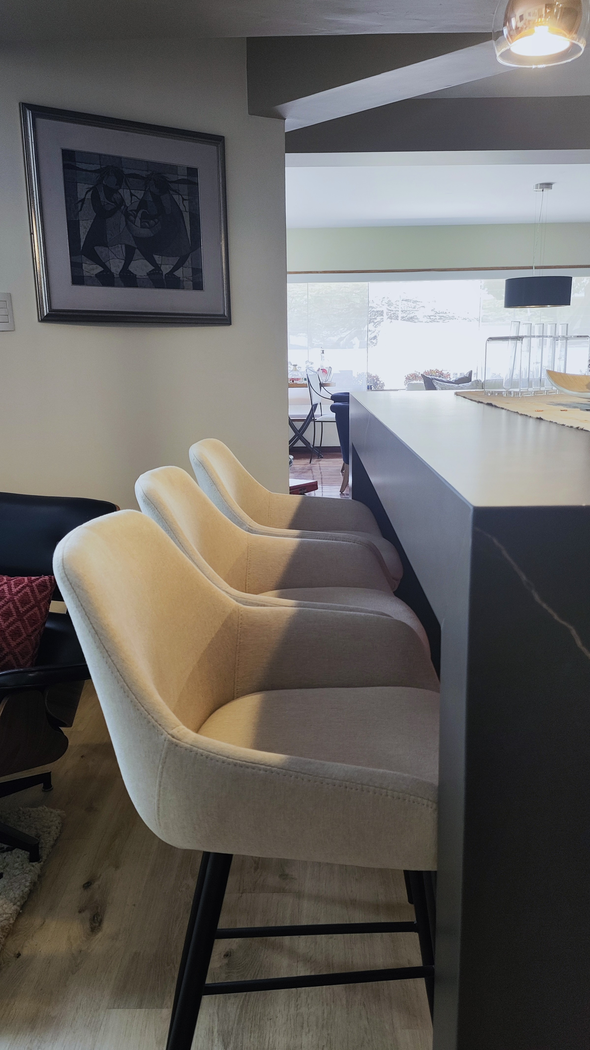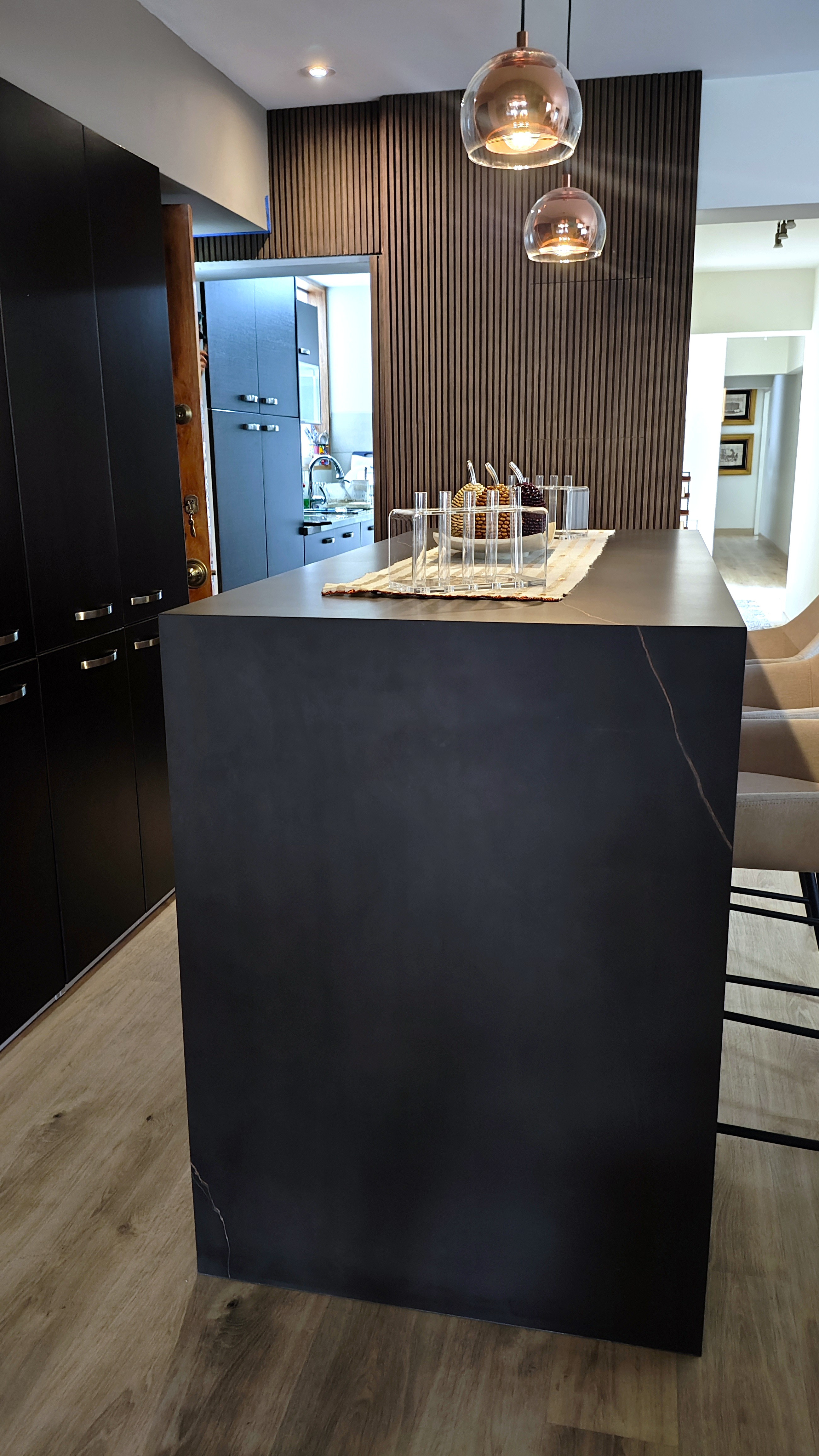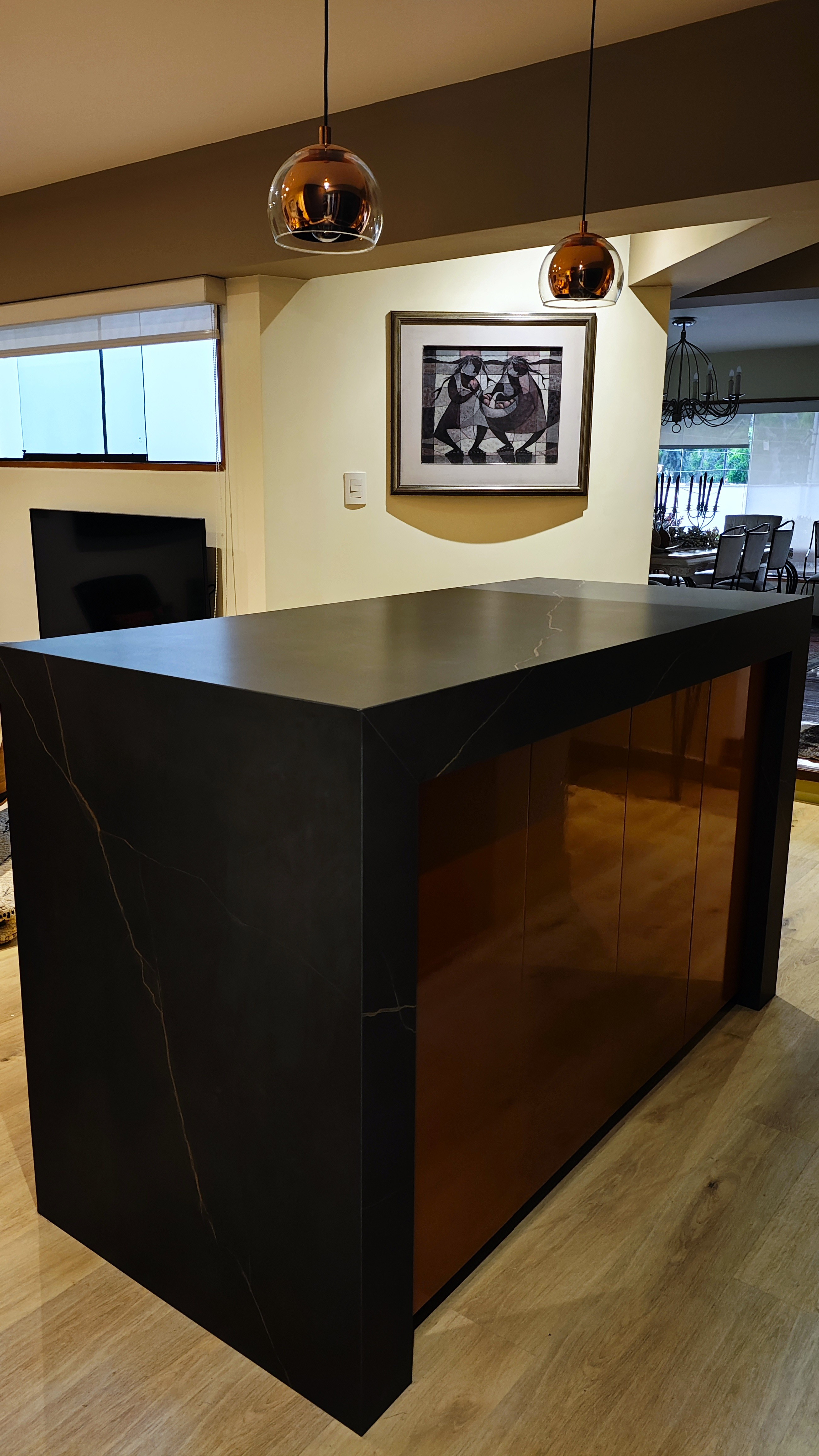 Se instaló una barra de piedra sinterizada, acompañada de muebles en MDF enchapado y pintado, logrando una integración funcional y estética.